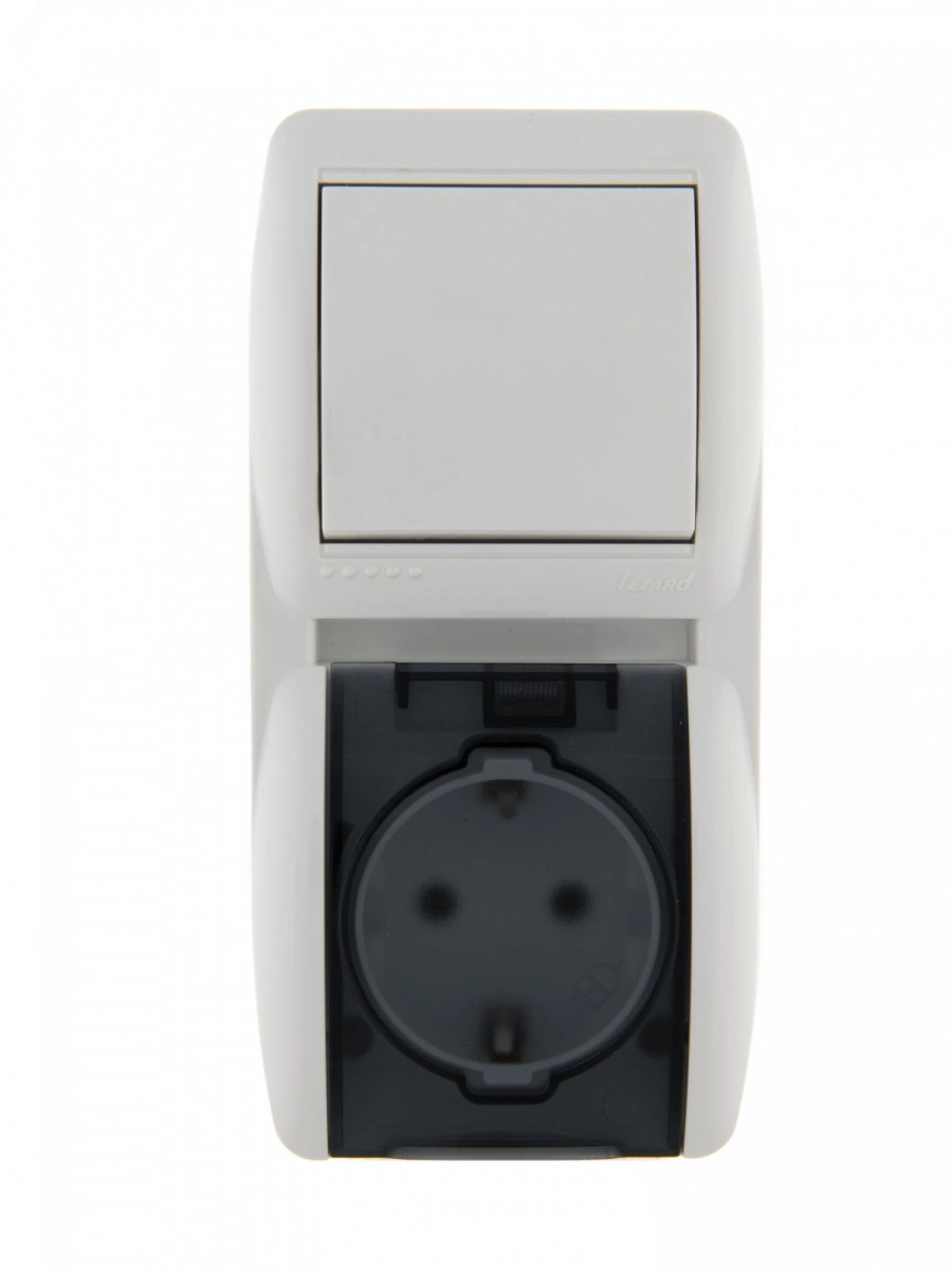 Полное описание: Выключатель одноклавишный, с розеткой с заземлением крышкой, белый, вертикальный
