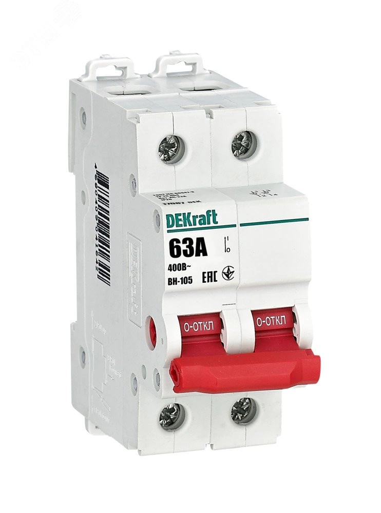 Выключатель-разъединитель серии ВН-105 Dekraft, 2-полюсный, номинальный ток 63 А, установка - на 35мм DIN-рейку, установочное положение - любое, с красной рукояткой управления. Высокие характеристики механической и электрической износостойкости. Категория применения AC-22A. Применяется для ручного включения/отключения сетей напряжением 230 В AC. Специальные мостиковые контакты обеспечивают надежный разрыв цепи, они полностью исключают возможность перекрытия дугой по изоляции.