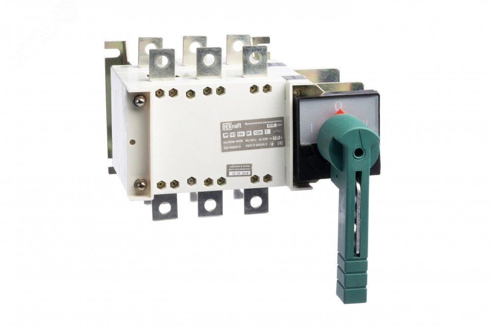 Выключатель-разъединитель серии ВР-101 тип WT DEKraft, 3P, реверсивный, тип Т (Тандем), с видимым разрывом, номинальный ток 400 А, типоразмер 630, ном.напряжение до 690 В, 50 Гц, категория применения - АС-22В (смешанные активные и индуктивные нагрузки). Двойной разрыв контактов обеспечивает надежное гашение дуги и снижает риск повреждений. Подвод питания возможен как сверху, так и снизу аппарата. Медные клеммы обеспечивают высокую электрическую проводимость и удобство подключения проводников.