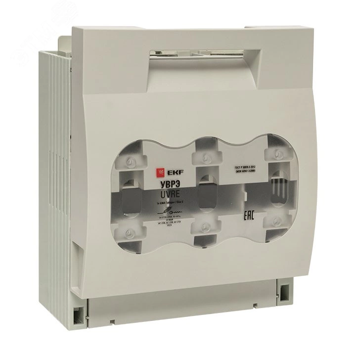 Выключатели-разъединители УВРЭ откидного типа с плавкими предохранителями предназначены для ручного включения-отключения и для защиты от коротких замыканий и перегрузки цепей переменного тока. Применяются в вводно-распределительных устройствах, шкафов управления и др. Видимый разрыв обеспечивается благодаря откидной крышке, с установленными предохранителями. При открывании крышки происходит разрыв цепи. В крышке предусмотрены контрольные отверстия для измерения напряжения и других параметров специальным щупом. Выключатели устанавливаются на монтажную панель. Конструкция контактных выводов обеспечивает болтовое присоeдинение шин или проводников, оконцованных кабельными наконечниками. Выводы изготавливаются из меди с антикоррозийным покрытием.