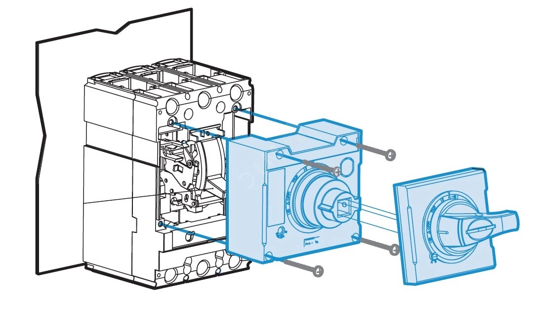 Поворотная рукоятка для управления выключателем выпускается как в стандартном , так и в выносном исполнении для установки на двери щита. Рукоятка всегда оснащается замком для блокировки двери щита. Существуют исполнения рукоятки - левое (L), правое (R), по центру (S)