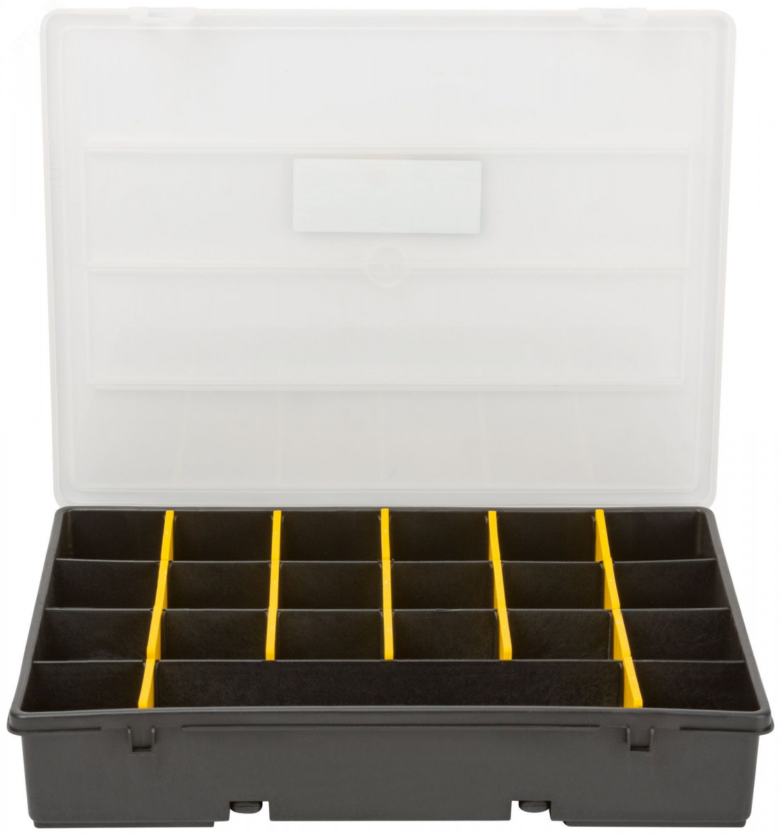 Способствует организованному хранению большого количества мелких деталей и крепежа|Пластиковые замки надежно запирают органайзер и предотвращают непреднамеренное раскрытие|Прозрачная крышка позволяет видеть расположение вещей внутри