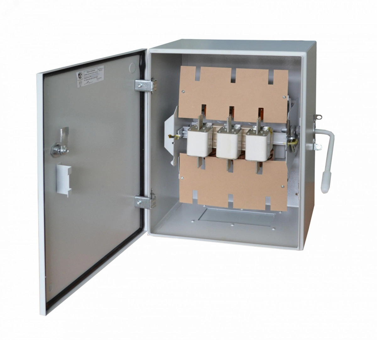 Ящик с блоком 'Предохранитель - Выключатель' унифицированный 250 Ампер. Отличительной особенностью является подвижный блок с предохранителями, выполняющих функцию подвижного контакта. Силовые проводники подключаются к неподвижным контактам основания предохранителей. Отключение силовой цепи обеспечивается двойным видимым разрывом. Механизм включения – отключения защищен патентом РФ на «Полезную модель», имеется возможность блокировки дверки, а также есть возможность дополнительно заблокировать рукоятку от оперирования висячим замком. Блок предназначен для нечастых (не более трех в час) включений – отключений силовых цепей, напряжением до 400В переменного тока частотой 50Гц, а также защиты их при перегрузках и коротких замыканиях. Оснащен уголком заземления, защищенным от краски, с двумя отверстиями.