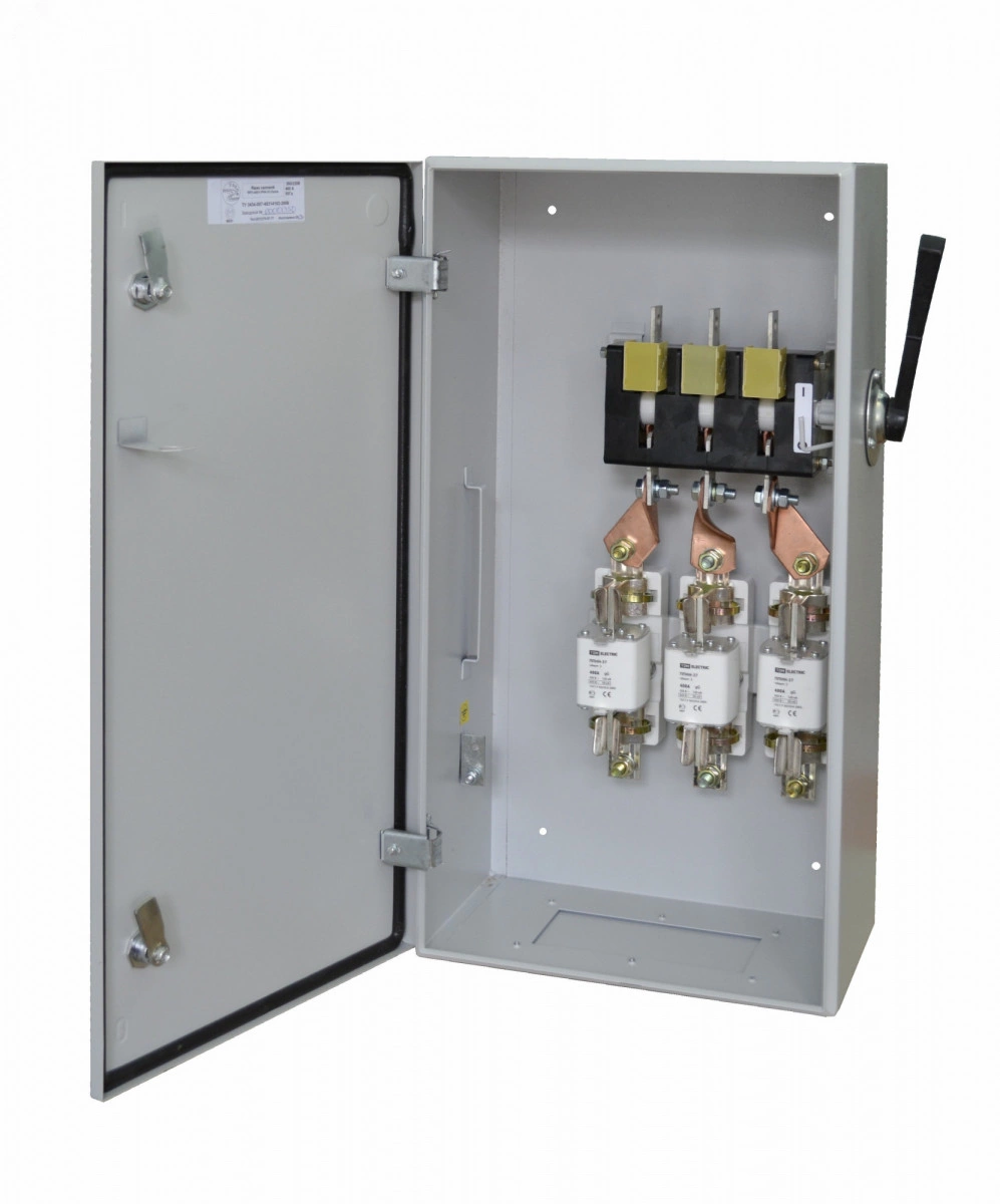 Ящик с рубильником и предохранителями, улучшенный 400 Ампер предназначен для подключения одной линии ввода и одной отходящей линии. Особенностью является наличие рубильника ВР 32 для включения - отключения силовой цепи. Предохранители улучшенной серии ППН, обладающие энергосберегающими свойствами, соответствующими требованиям МЭК, установлены неподвижно. Вводные проводники подключаются к рубильнику ВР 32, отходящие к неподвижным контактам-основаниям предохранителей. Отключение силовой цепи обеспечивается двойным видимым разрывом. Имеется возможность блокировки дверки от открытия при включенном рубильнике. Материал корпуса-самозатухающий пластик, электробезопасный материал, стойкий к механическим воздействиям, тепловым воздействиям и динамическим ударам. Конструкция корпуса облегчена, что способствует лучшему охлаждению токопроводящих частей, снижению электрических потерь.