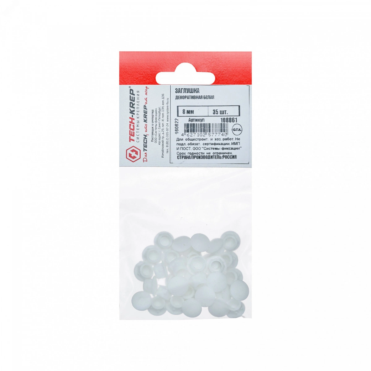 Заглушка декоративная 8 мм белая (35 шт) - пакет Tech-Krep