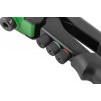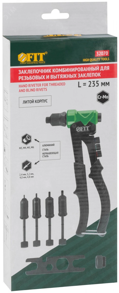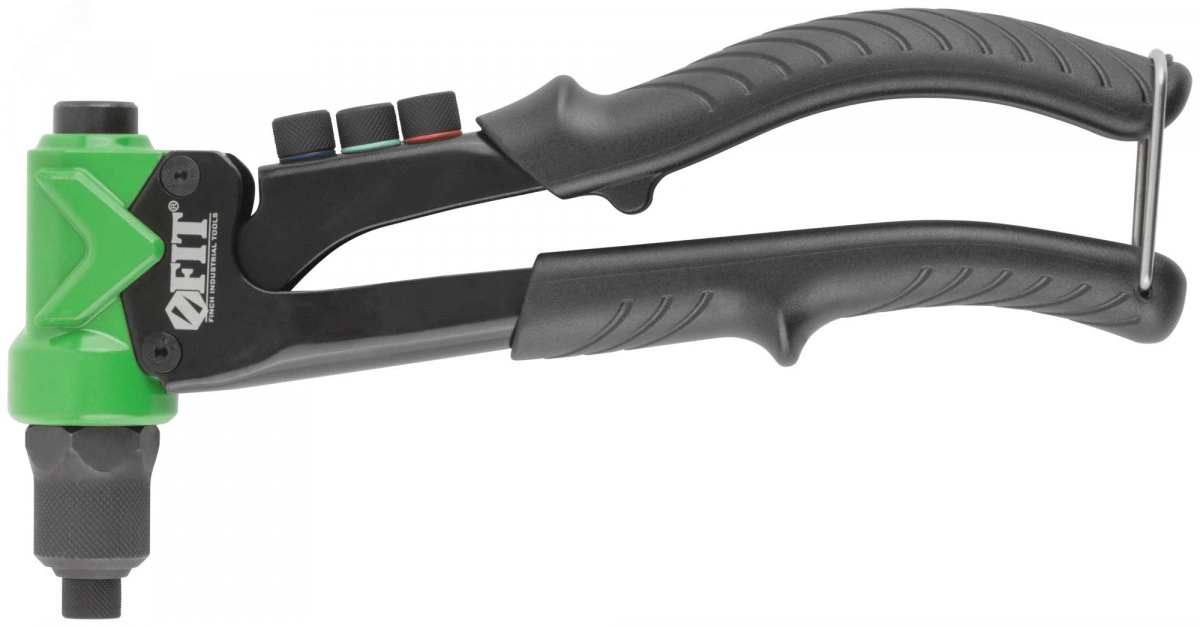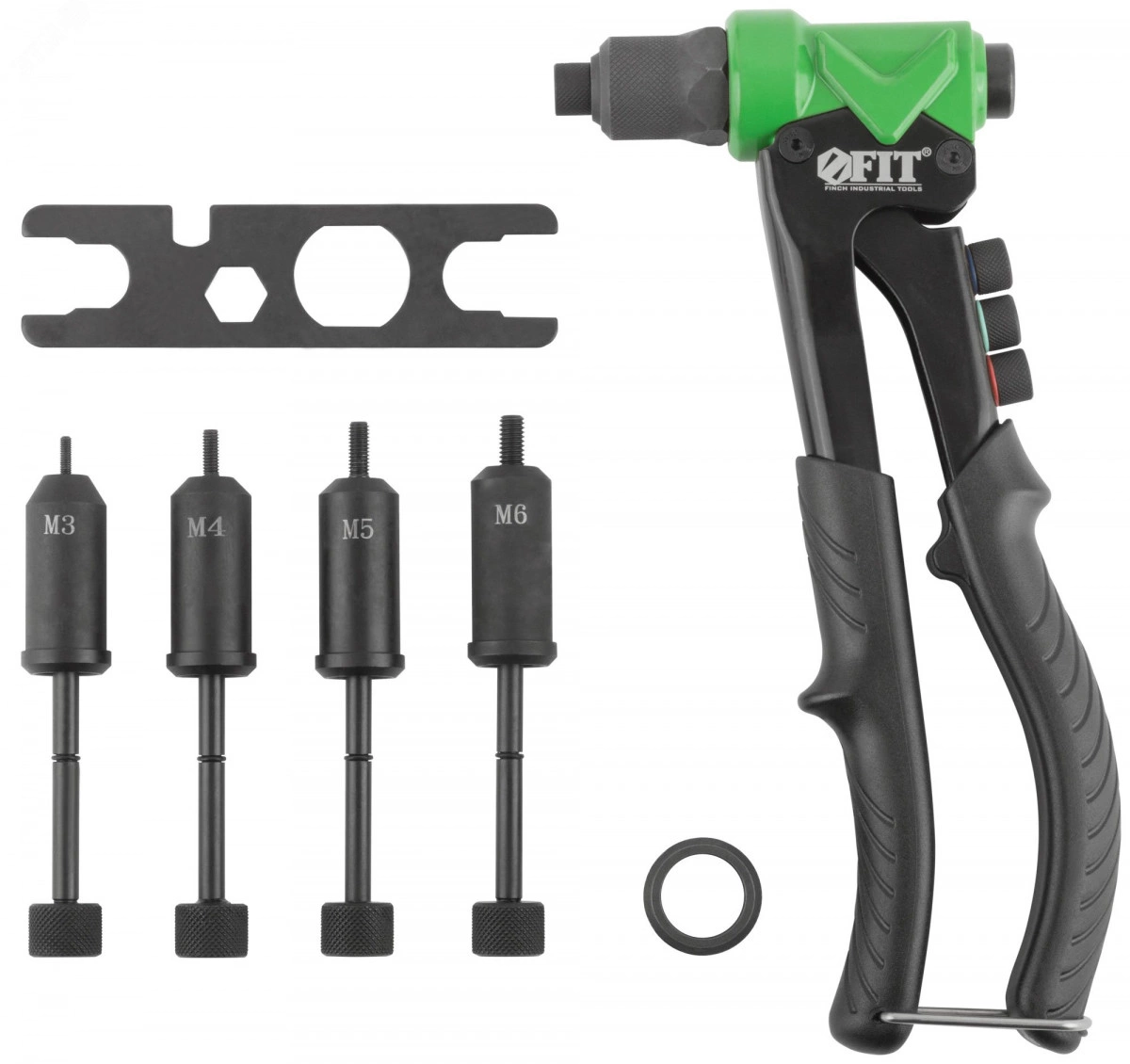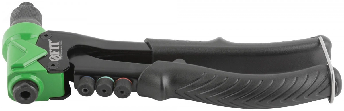 Комбинированный заклепочник FIT HQ предназначен для работ как с вытяжными, так и с резьбовыми заклепками. Корпус инструмента выполнен из литого алюминиевого сплава, благодаря чему сочетает в себе легкость и прочность. Утолщенные рукоятки из инструментальной стали обеспечивают длительный срок службы инструмента. Насадки для резьбовых заклепок-гаек выполнены из закаленной хром-молибденовой стали и обладают высокой износостойкостью. Быстросменные насадки для вытяжных заклепок прочно фиксируются в рукоятке. Фиксация рабочих насадок обеспечивается резьбовыми соединениями. В модели предусмотрена скоба-фиксатор, которая способствует безопасному хранению инструментов в закрытом положении. Возвратная пружина облегчает процесс работы.