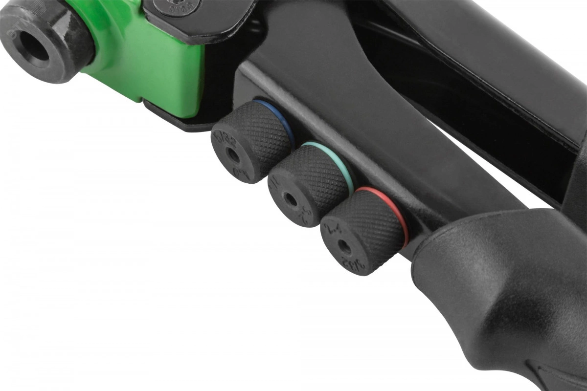 Корпус из алюминиевого сплава сочетает в себе легкость и прочность|Утолщенные рукоятки из инструментальной стали обеспечивают длительный срок службы|Обладает широким спектром применения за счет совместимости с различными типами заклепок|Насадки для р