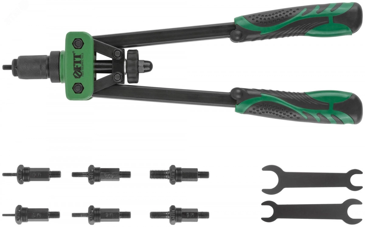Профи. Для скрепления листовых материалов с помощью вытяжных и резьбовых заклепок из алюминия, стали и нержавеющей стали. Для работы в труднодоступных местах, с поворотным механизмом 0-360°. Усиленная конструкция. Литой корпус. 4 быстросменных насадки для вытяжных заклепок, 4 насадки для резьбовых заклепок и ключ для смены насадок вкомплекте. Материал - корпус из алюминиевого сплава, ручки из инструментальной стали с ПВХ накладками, насадки для вытяжных заклепок из инструментальной стали, насадки для резьбовых заклепок из хром- молибденовой стали. Упаковка - пластиковый кейс.