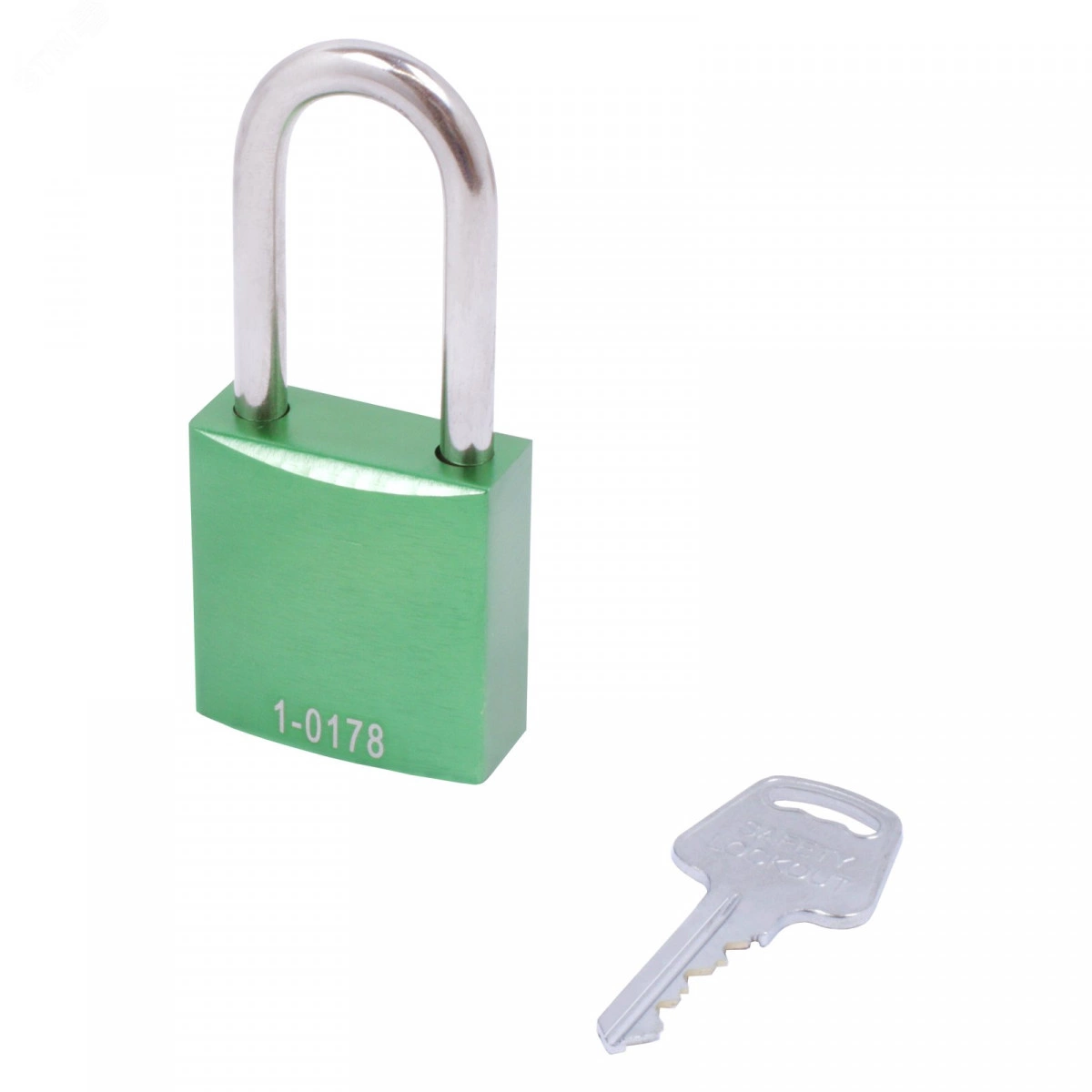 Замок навесной. Алюминиевый корпус, устойчивый к УФ-лучам, химически агрессивным средам и температурам, размер корпуса 40x45 мм (ВxШ), стальная дужка с покрытием из хрома, высота от корпуса до дужки 38 мм, диаметр дужки 6 мм, латунный цилиндр (6 пин) с 1 ключом, цвет корпуса зеленый, система ключей KD/KA/MK/KAMK.