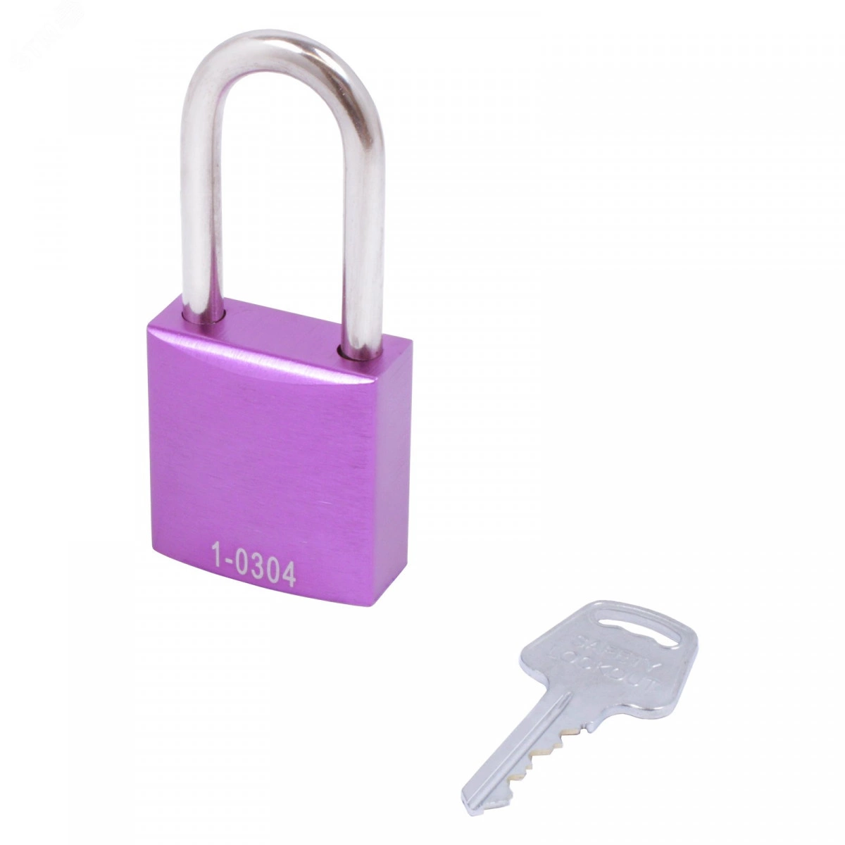 Замок навесной. Алюминиевый корпус, устойчивый к УФ-лучам, химически агрессивным средам и температурам, размер корпуса 40x45 мм (ВxШ), стальная дужка с покрытием из хрома, высота от корпуса до дужки 38 мм, диаметр дужки 6 мм, латунный цилиндр (6 пин) с 1 ключом, цвет корпуса фиолетовый, система ключей KD/KA/MK/KAMK.