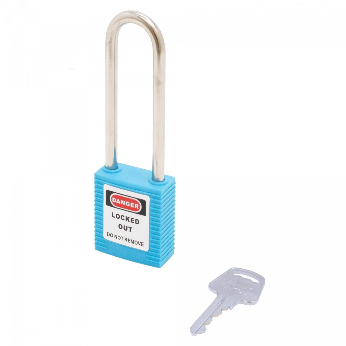 Замок навесной. Пластиковый корпус устойчивый к УФ-лучам, химически агрессивным средам и температурам, размер корпуса 45x40x20 мм (ВxШxГ), дужка из нержавеющей стали, высота от корпуса до дужки 76 мм, диаметр дужки 6 мм, латунный цилиндр (6 пин) с 1 ключом, цвет корпуса синий, система ключей KA/KD/MK/KAMK.