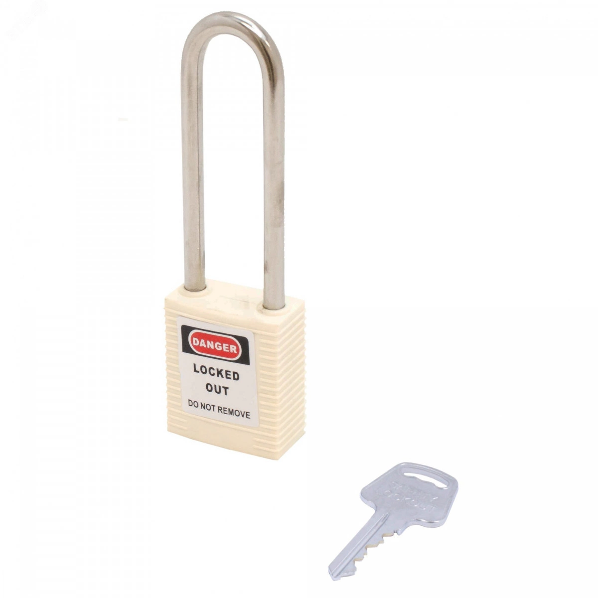 Замок навесной. Пластиковый корпус устойчивый к УФ-лучам, химически агрессивным средам и температурам, размер корпуса 45x40x20 мм (ВxШxГ), дужка из нержавеющей стали, высота от корпуса до дужки 76 мм, диаметр дужки 6 мм, латунный цилиндр (6 пин) с 1 ключом, цвет корпуса белый, система ключей KA/KD/MK/KAMK.