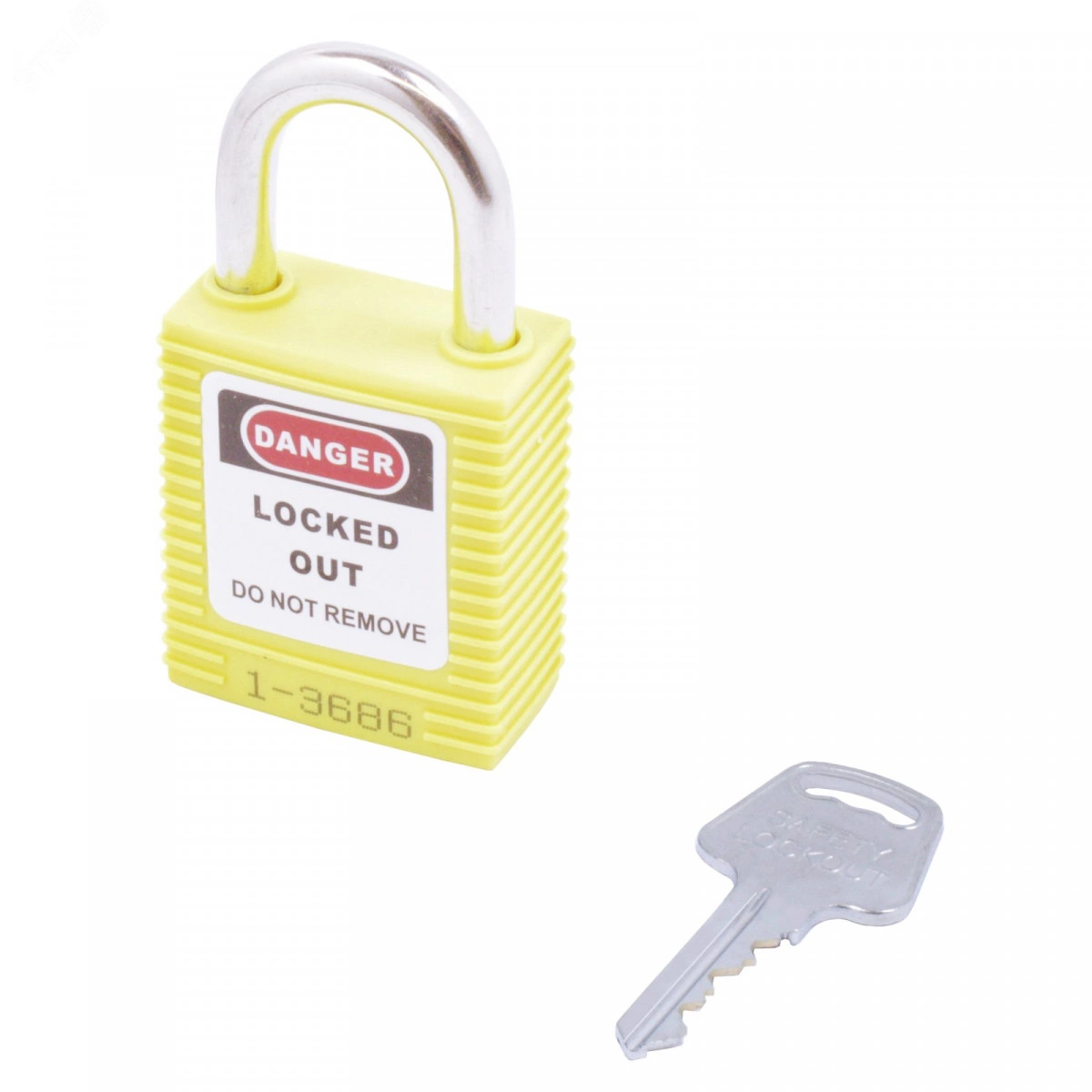 Замок навесной. Пластиковый корпус устойчивый к УФ-лучам, химически агрессивным средам и температурам, размер корпуса 45x40x20 мм (ВxШxГ), дужка из нержавеющей стали, высота от корпуса до дужки 25 мм, диаметр дужки 6 мм, латунный цилиндр (6 пин) с 1 ключом, цвет корпуса желтый, система ключей KA/KD/MK/KAMK.