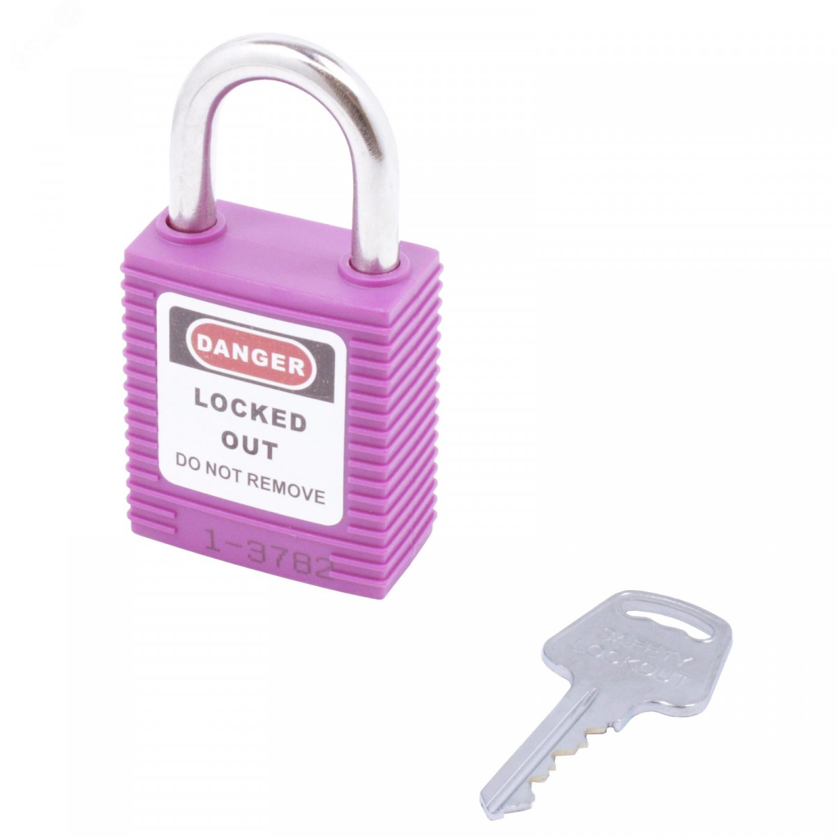 Замок навесной. Пластиковый корпус устойчивый к УФ-лучам, химически агрессивным средам и температурам, размер корпуса 45x40x20 мм (ВxШxГ), дужка из нержавеющей стали, высота от корпуса до дужки 25 мм, диаметр дужки 6 мм, латунный цилиндр (6 пин) с 1 ключом, цвет корпуса фиолетовый, система ключей KA/KD/MK/KAMK.