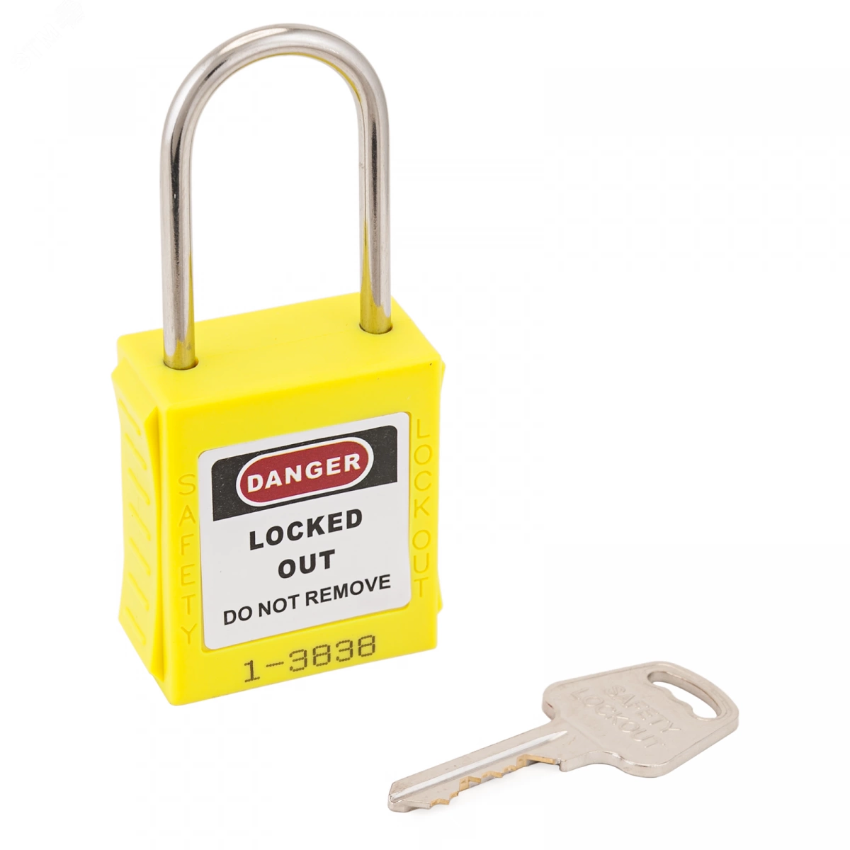 Замок навесной. Пластиковый корпус устойчивый к УФ-лучам, химически агрессивным средам и температурам, размер корпуса 45x40x20 мм (ВxШxГ), дужка из нержавеющей стали, высота от корпуса до дужки 38 мм, диаметр дужки 4 мм, латунный цилиндр (6 пин) с 1 ключом, цвет корпуса желтый, система ключей KA/KD/MK/KAMK.