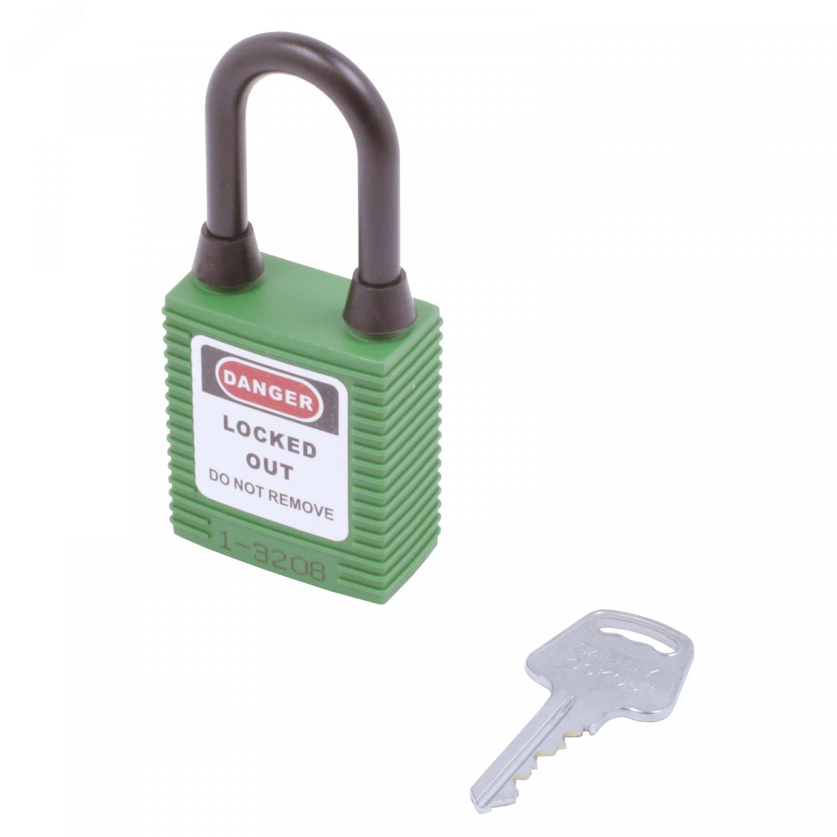 Замок навесной. Пластиковый пылезащищенный корпус устойчивый к УФ-лучам, химически агрессивным средам и температурам, размер корпуса 45x40x20 мм (ВxШxГ), нейлоновая дужка, высота от корпуса до дужки 38 мм, диаметр дужки 6 мм, латунный цилиндр (6 пин) с 1 ключом, цвет корпуса зеленый, система ключей KA/KD/MK/KAMK.