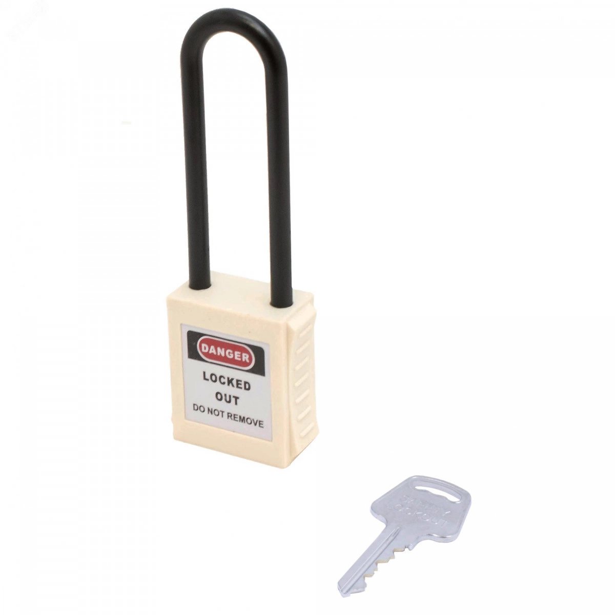 Замок навесной. Пластиковый корпус устойчивый к УФ-лучам, химически агрессивным средам и температурам, размер корпуса 45x40x20 мм (ВxШxГ), нейлоновая дужка, высота от корпуса до дужки 76 мм, диаметр дужки 6 мм, латунный цилиндр (6 пин) с 1 ключом, цвет корпуса белый, система ключей KA/KD/MK/KAMK.