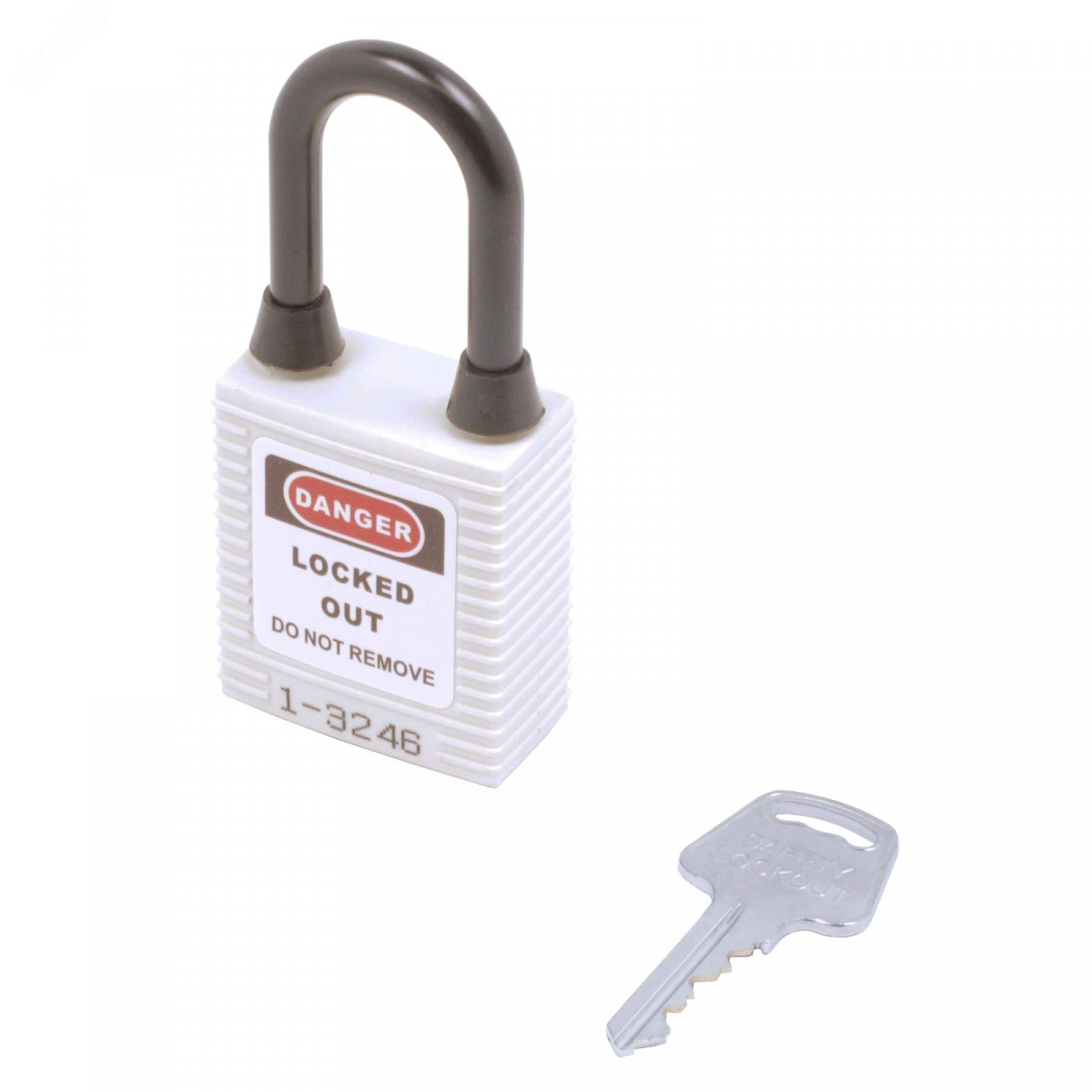 Замок навесной. Пластиковый пылезащищенный корпус устойчивый к УФ-лучам, химически агрессивным средам и температурам, размер корпуса 45x40x20 мм (ВxШxГ), нейлоновая дужка, высота от корпуса до дужки 38 мм, диаметр дужки 6 мм, латунный цилиндр (6 пин) с 1 ключом, цвет корпуса белый, система ключей KA/KD/MK/KAMK.