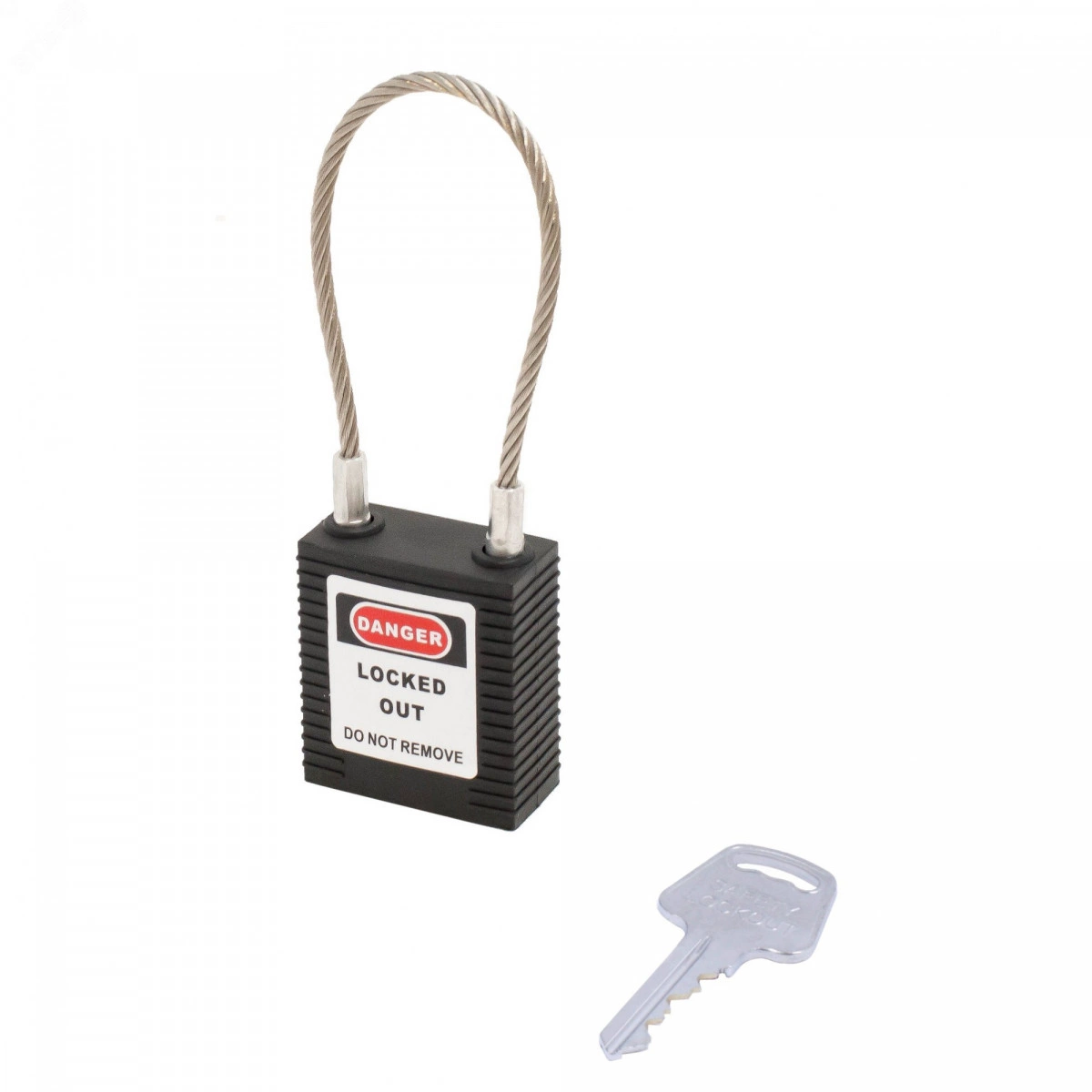 Замок навесной. Пластиковый корпус устойчивый к УФ-лучам, химически агрессивным средам и температурам, размер корпуса 45x40x20 мм (ВxШxГ), дужка из стального троса длиной 175 мм, диаметр дужки 3.2 мм, латунный цилиндр (6 пин) с 1 ключом, цвет корпуса черный, система ключей KA/KD/MK/KAMK.