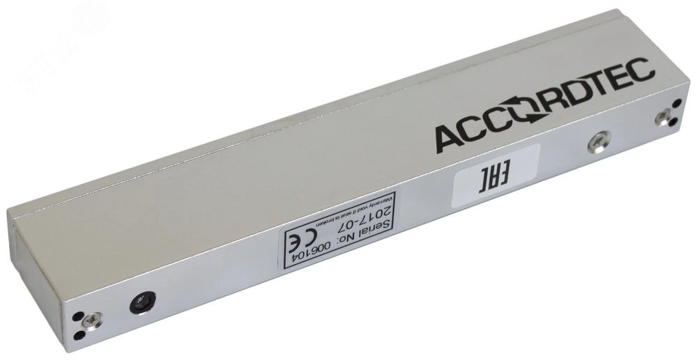 Электромагнитный замок, выполнен в офисном дизайне, предназначен для использования в качестве оконечного устройства в системах контроля и управления доступом, автоматики пожарных и запасных выходов, системах охраны объекта и т.п. Имеет силу удержания равную 180 кг, датчик Холла (выход реле - NO, NC, COM), механический компенсатор эффекта остаточной намагниченности на якоре.