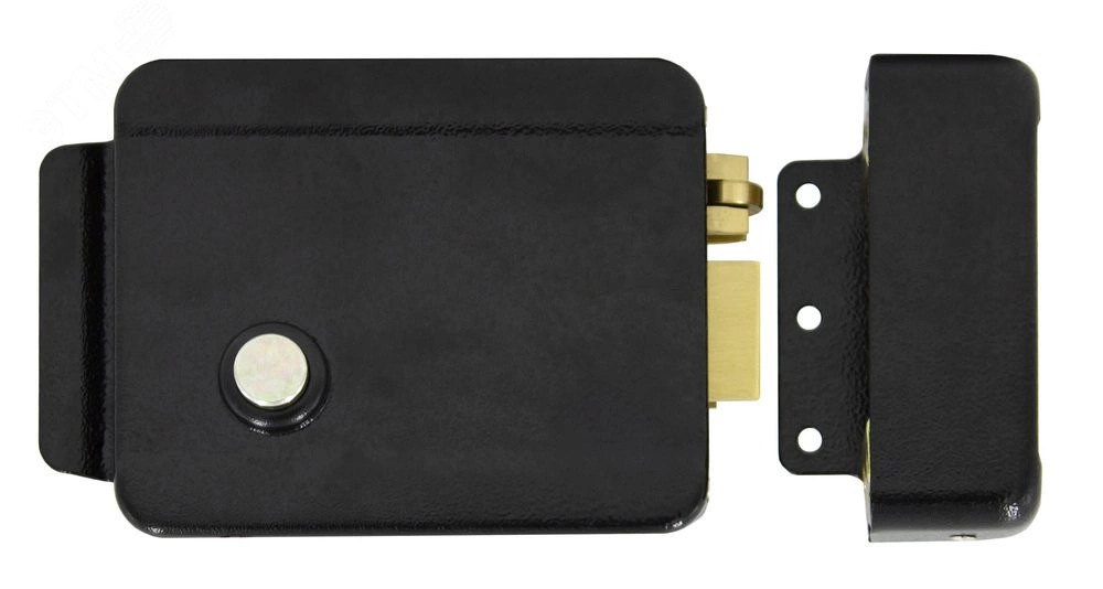 Электромеханический накладной замок, НЗ, универсальный, цилиндр снаружи, кнопка изнутри, ролик взвода пружины, сталь, цвет черный, 12 В, 3,5 А, 163х47х103 мм. Масса брутто 1300 г. Допускается использование электромеханического замка в диапазоне температур окружающей среды от -30 градусов С до +50 градусов С.