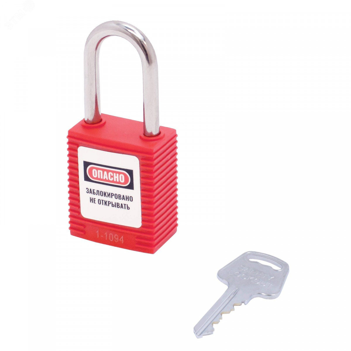 Замок навесной. Пластиковый корпус устойчивый к УФ-лучам, химически агрессивным средам и температурам, размер корпуса 45x40x20 мм (ВxШxГ), дужка из нержавеющей стали, высота от корпуса до дужки 38 мм, диаметр дужки 6 мм, латунный цилиндр (6 пин) с 1 ключом, цвет корпуса красный, система ключей KA/KD/MK/KAMK.