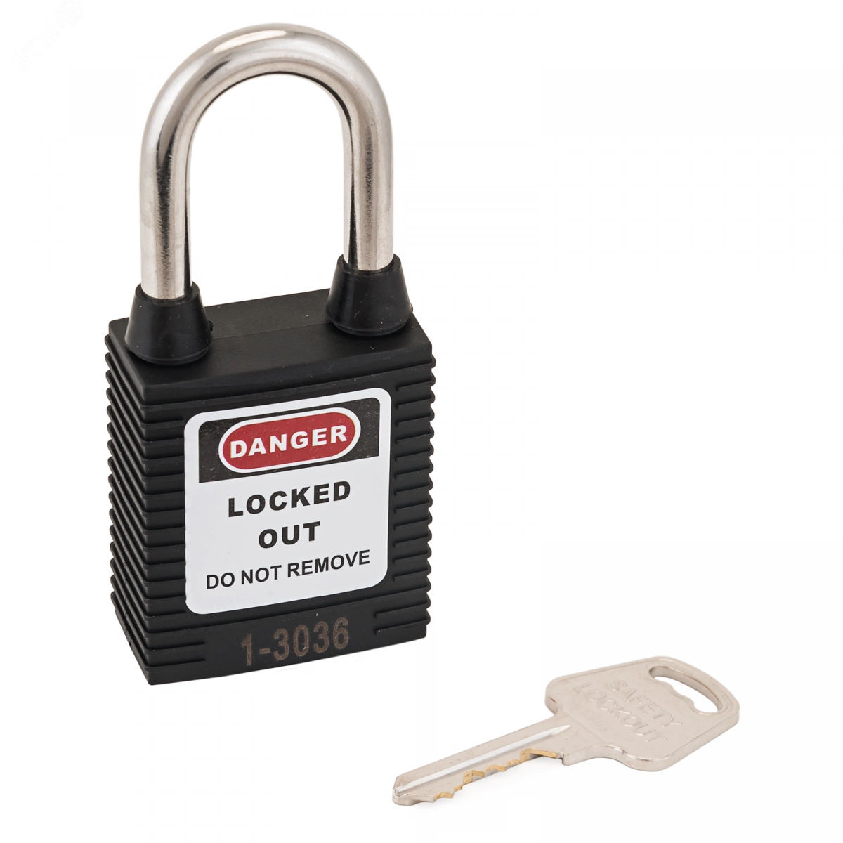 Замок навесной. Пластиковый пылезащищенный корпус устойчивый к УФ-лучам, химически агрессивным средам и температурам, размер корпуса 45x40x20 мм (ВxШxГ), дужка из нержавеющей стали, высота от корпуса до дужки 38 мм, диаметр дужки 6 мм, латунный цилиндр (6 пин) с 1 ключом, цвет корпуса черный, система ключей KA/KD/MK/KAMK.