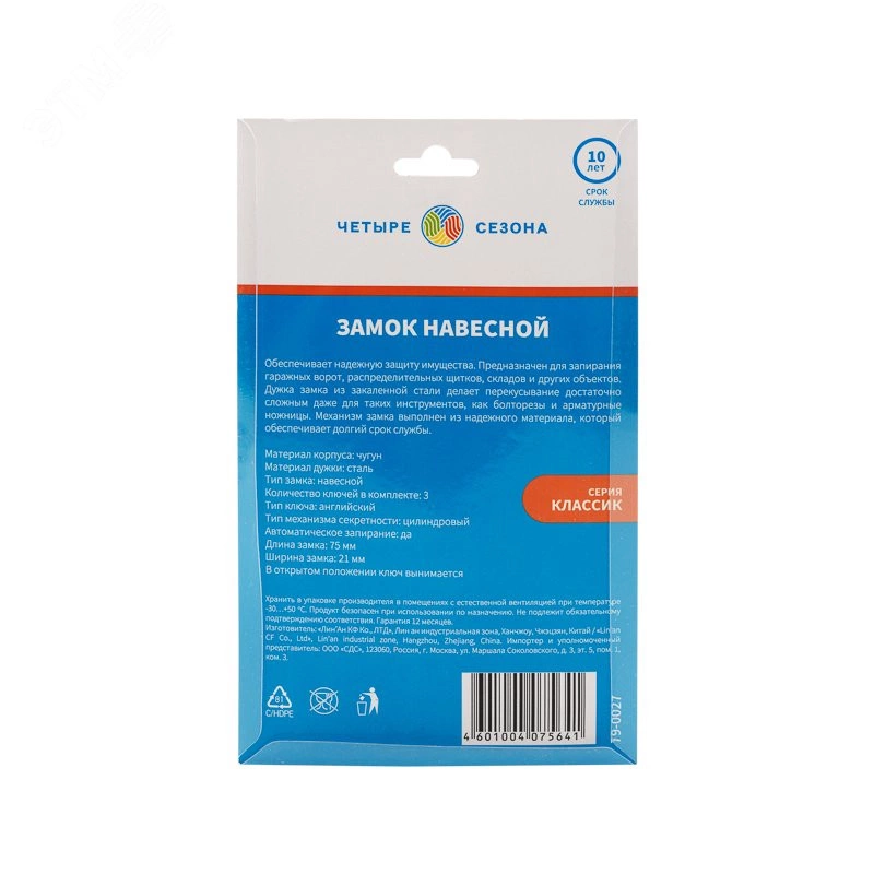 Замок навесной, размер 75 мм. Используется для закрывания дверей с петлями для защиты имущества от недобросовестных людей. Для профилактики коррозии и легкости работы механизма замка его сувальды необходимо смазывать. В теплый период года вполне достаточно смазывать обычным маслом, в холодный период года желательно пользоваться размораживателем замков с силиконовой смазкой, для защиты замка от замерзания.