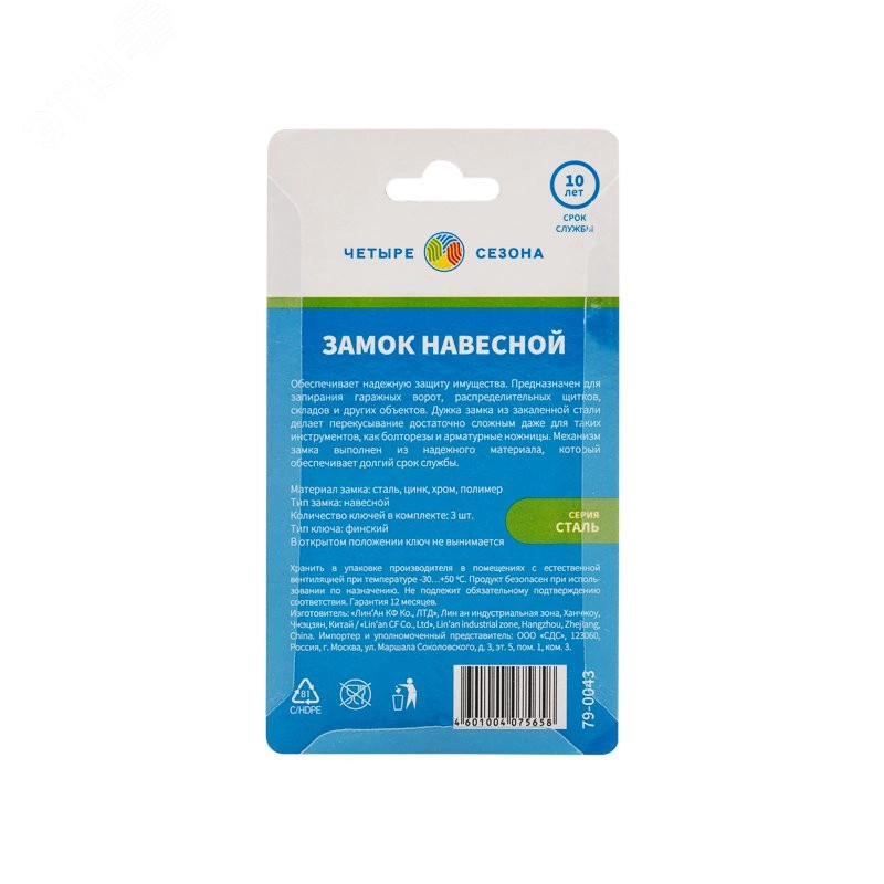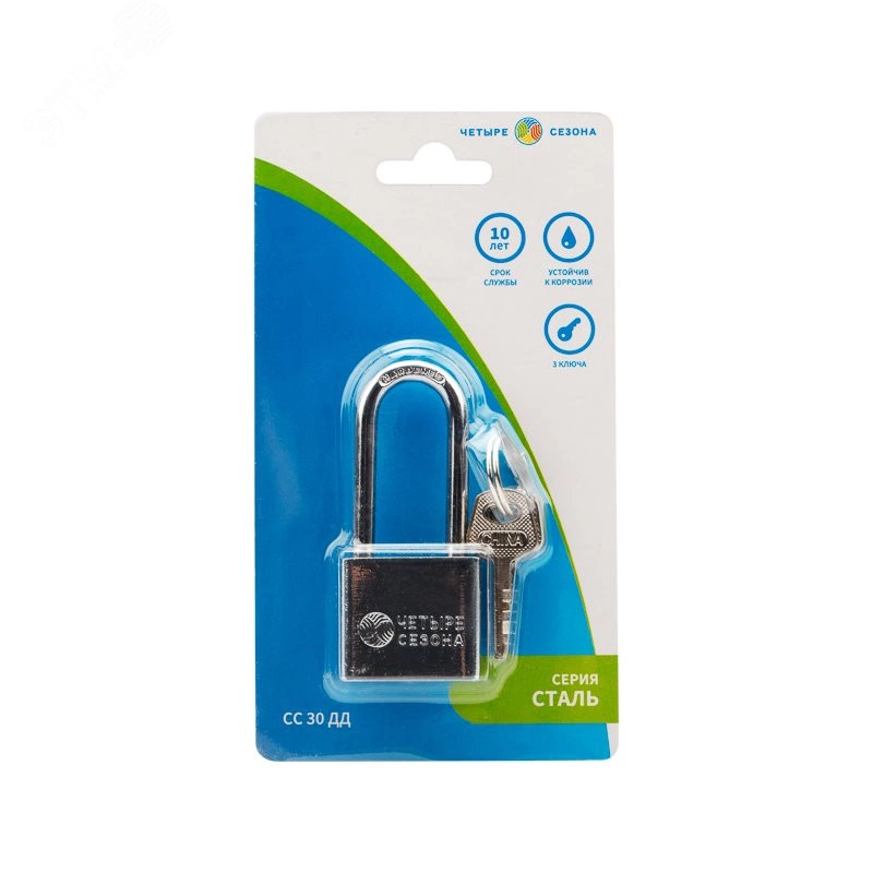 Навесной замок ЧЕТЫРЕ СЕЗОНА идеально подходит для защиты вашего имущества от непрошенных гостей. Замок пригодится для запирания гаражных ворот, распределительных щитков, складов и других объектов. Дужка замка выполнена из закаленной стали, что делает её перекусывание достаточно сложным даже для таких инструментов, как болторезы и арматурные ножницы. Механизм замка выполнен из долговечного и надежного материала. В комплекте с замком идет 3 ключа, поэтому при потере одного вам не нужно беспокоиться. Все эти свойства позволят эксплуатировать замок до 5 лет.