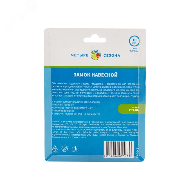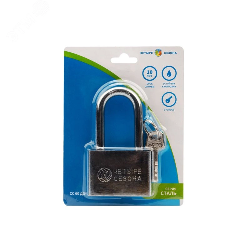 Навесной замок ЧЕТЫРЕ СЕЗОНА идеально подходит для защиты вашего имущества от непрошенных гостей. Замок пригодится для запирания гаражных ворот, распределительных щитков, складов и других объектов. Дужка замка выполнена из закаленной стали, что делает её перекусывание достаточно сложным даже для таких инструментов, как болторезы и арматурные ножницы. Механизм замка выполнен из долговечного и надежного материала. В комплекте с замком идет 3 ключа, поэтому при потере одного вам не нужно беспокоиться. Все эти свойства позволят эксплуатировать замок до 5 лет.