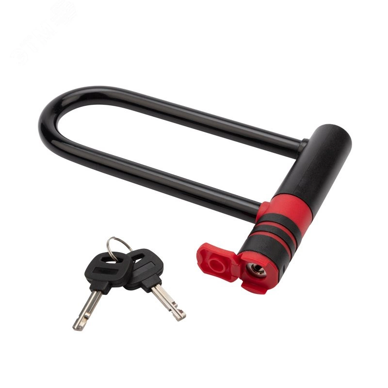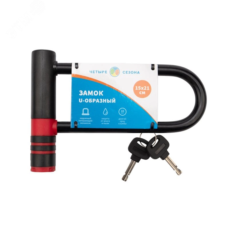 Замок-скоба ЧЕТЫРЕ СЕЗОНА универсального черного цвета – надежное и проверенное средство от кражи велосипедов, мопедов, колясок, рекламных щитов, вывесок и другого имущества. Отличается простой конструкцией, удобством транспортировки и высокой степенью стойкости к взлому. Размер замка составляет 15х21 см.