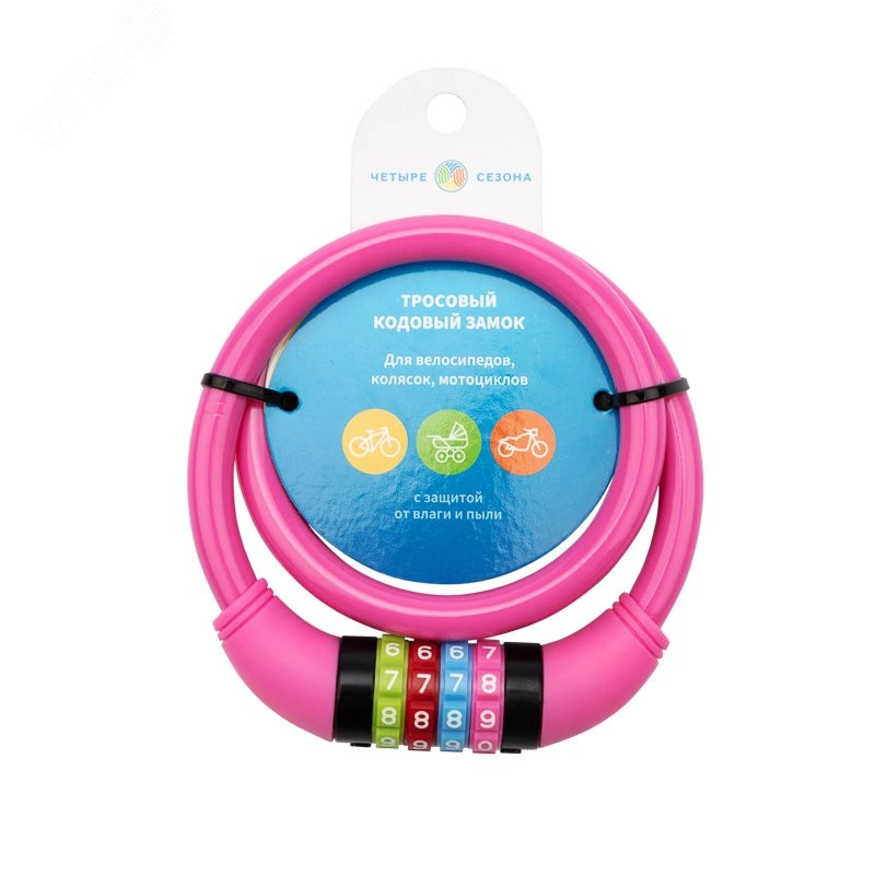Тросовый кодовый замок ЧЕТЫРЕ СЕЗОНА – недорогое и надежное средство от кражи велосипедов, мопедов, колясок, рекламных щитов, вывесок и другого имущества. Отличается простой конструкцией, удобством транспортировки и высокой степенью стойкости к взлому. Трос в износостойкой пластиковой оболочке имеет гибкую конструкцию с надежным кодовым замком, позволяющим, при необходимости, менять комбинации, избегая потери ключей, в отличие от моделей со стандартными замками. Длина замка составляет 65 см.