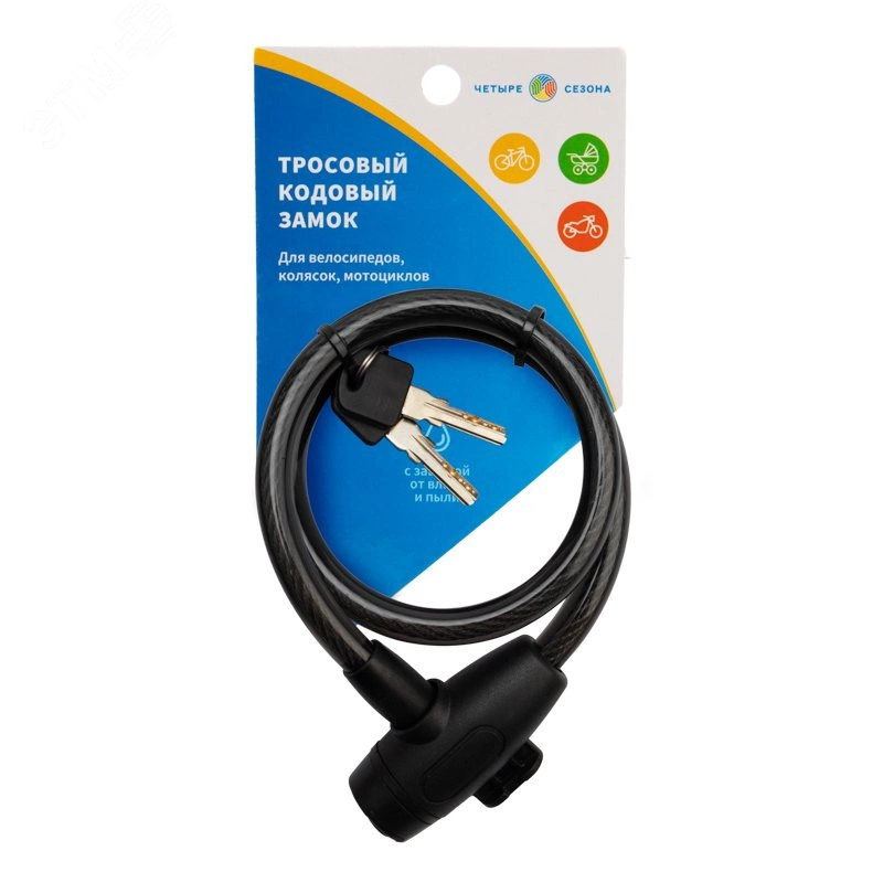 Тросовый замок с ключом ЧЕТЫРЕ СЕЗОНА – недорогое и надежное средство от кражи велосипедов, мопедов, колясок, рекламных щитов, вывесок и другого имущества. Отличается простой конструкцией, удобством транспортировки и высокой степенью стойкости к взлому. Трос в износостойкой пластиковой оболочке имеет гибкую конструкцию с надежным замком. В комплект входит компактный ключ, который с легкостью помещается в кармане или в кошельке. Длина замка составляет 65 см.
