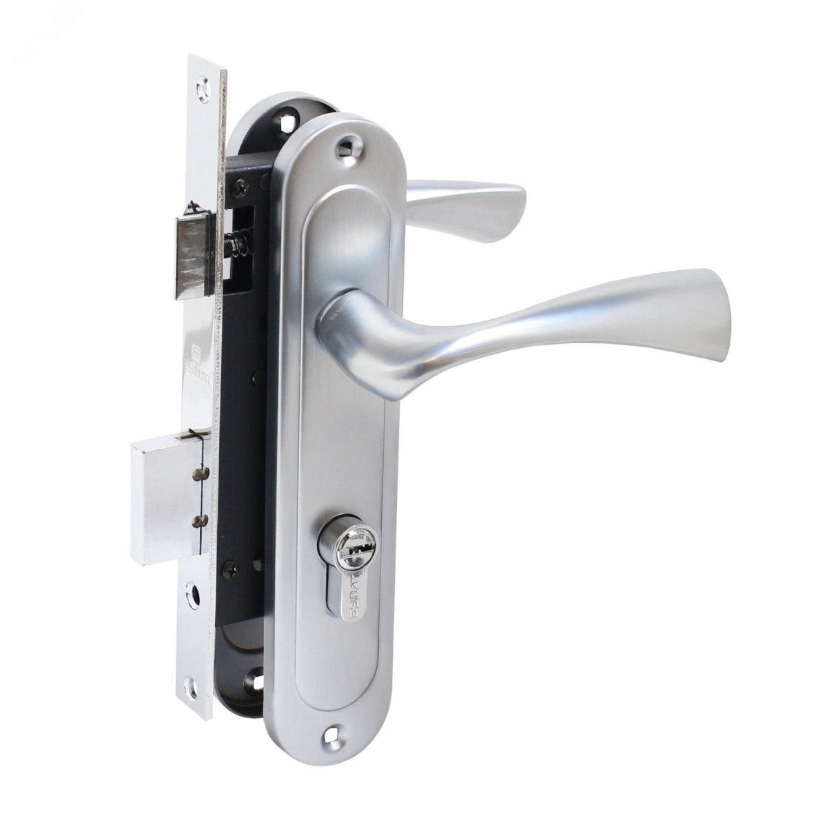 "БУЛАТ ЗВ4-1.70.03.07 НОМОС титан 5 перф.кл. Замок врезной с/руч (12). ""Замок врезной с ручками. Предназначен для установки в деревянные двери толщиной 35-45 мм, правого и левого открывания. Дверь может быть закрыта на защелку и открыта с помощью фалевой ручки при открытом засове замка. Один сплошной стальной ригель размером 20х38мм. Универсальная защелка. Стальной корпус покрыт полимерной краской. Межосевое расстояние 70 мм. Удаление ключевого отверстия 40мм. Материал ручек - алюминиевый сплав. Комплектация - латунный цилиндровый механизм 62мм, 5 перфоключей, ответная планка, винтовые стяжки"""