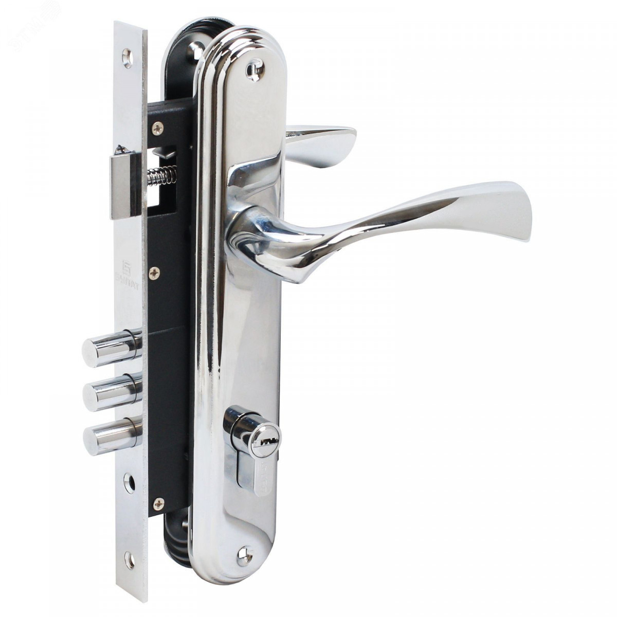 БУЛАТ ЗВ4-3.03.04 НОМОС хром 5 перф.кл. Замок врезной с/руч (12). Замок врезной с ручками. Предназначен для установки в деревянные двери толщиной 35-45 мм, правого и левого открывания. Дверь может быть закрыта на защелку и открыта с помощью фалевой ручки при открытом засове замка. Три круглых стальных ригеля диаметром 12 мм и вылетом 20мм. Универсальная защелка. Стальной корпус с подшипником, покрыт полимерной краской. Межосевое расстояние 85 мм. Удаление ключевого отверстия 45мм. Материал ручек - сплав ЦАМ. Комплектация -латунный цилиндровый механизм 62мм, 5 перфоключей, ответная планка, винтовые стяжки.
