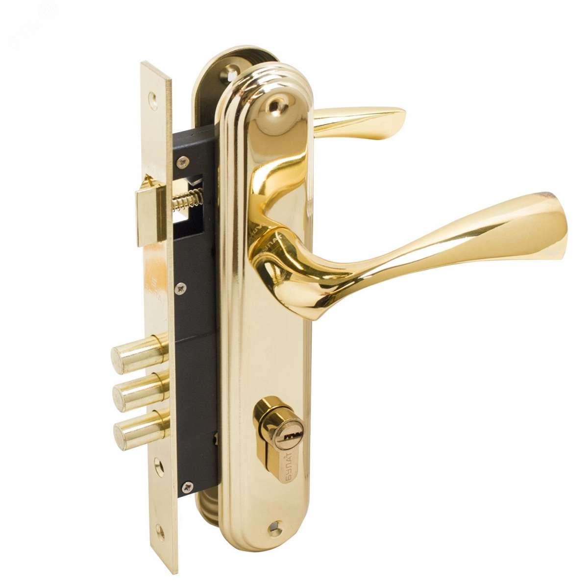 БУЛАТ ЗВ4-3.03.05 НОМОС золото 5 перф.кл. Замок врезной с/руч (12). Замок врезной с ручками. Предназначен для установки в деревянные двери толщиной 35-45 мм, правого и левого открывания. Дверь может быть закрыта на защелку и открыта с помощью фалевой ручки при открытом засове замка. Три круглых стальных ригеля диаметром 12 мм и вылетом 20мм. Универсальная защелка. Стальной корпус с подшипником, покрыт полимерной краской. Межосевое расстояние 85 мм. Удаление ключевого отверстия 45мм. Материал ручек - сплав ЦАМ. Комплектация -латунный цилиндровый механизм 62мм, 5 перфоключей, ответная планка, винтовые стяжки.