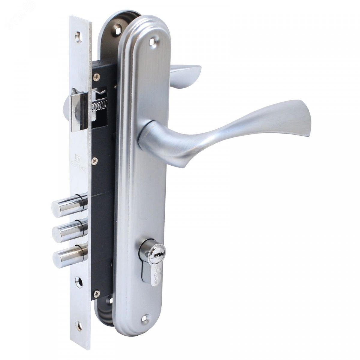 БУЛАТ ЗВ4-3.03.07 НОМОС титан 5 перф.кл. Замок врезной с/руч (12). Замок врезной с ручками. Предназначен для установки в деревянные двери толщиной 35-45 мм, правого и левого открывания. Дверь может быть закрыта на защелку и открыта с помощью фалевой ручки при открытом засове замка. Три круглых стальных ригеля диаметром 12 мм и вылетом 20мм. Универсальная защелка. Стальной корпус с подшипником, покрыт полимерной краской. Межосевое расстояние 85 мм. Удаление ключевого отверстия 45мм. Материал ручек - сплав ЦАМ. Комплектация -латунный цилиндровый механизм 62мм, 5 перфоключей, ответная планка, винтовые стяжки.