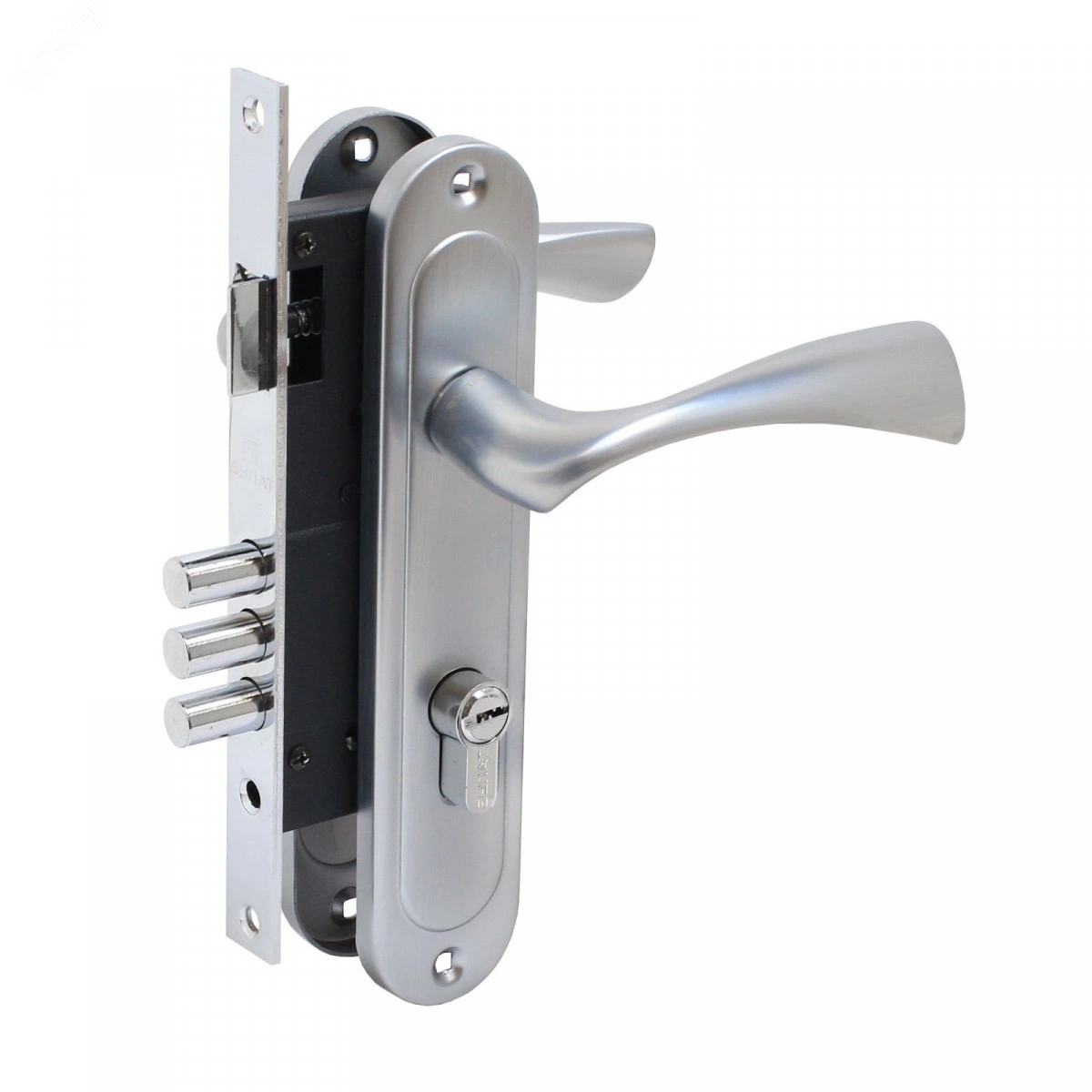БУЛАТ ЗВ4-3.70.03.07 НОМОС титан 5 перф.кл. Замок врезной с/руч (12). Замок врезной с ручками. Предназначен для установки в деревянные двери толщиной 35-45 мм, правого и левого открывания. Дверь может быть закрыта на защелку и открыта с помощью фалевой ручки при открытом засове замка. Три круглых стальных ригеля диаметром 12 мм. Универсальная защелка. Стальной корпус покрыт полимерной краской. Межосевое расстояние 70 мм. Удаление ключевого отверстия 45мм. Материал ручек - алюминиевый сплав. Комплектация - латунный цилиндровый механизм 62мм, 5 перфоключей, ответная планка, винтовые стяжки.