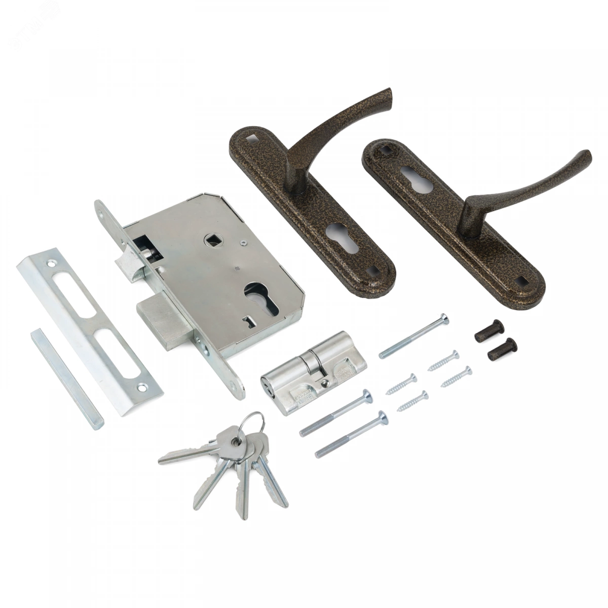 Замок врезной с ручками, цилиндровый. Предназначен для установки в деревянные двери толщиной до 50 мм, правого и левого открывания. Прямоугольный ригель из цинкового сплава, вылет ригеля 22мм. Стальной, оцинкованный корпус.Межосевое расстояние 55мм.Удаление ключевого отверстия 55мм. Ручки - алюминий, покрытие - краска. Комплектуется цилиндровым механизмом 70 мм с 4-мя ключами, ответной планкой и винтовыми стяжками. Класс замка 2.