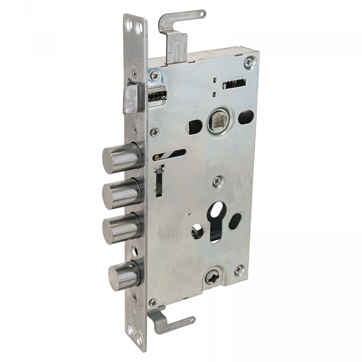 Замок врезной цилиндровый с защелкой и задвижкой, без механизма секрета. Предназначен для установки в китайские металлические двери, в качестве основного замка. Реверсивная защелка позволяет устанавливать замок на правые и левые двери. Три цилиндрических стальных ригеля. 3 точки запирания. Корпус замка - сталь, толщиной 0,9мм. Удаление ключевого отверстия 60мм. Межосевое расстояние 68мм. Расстояние от центра механизма секрета до задвижки 53мм. Ширина корпуса 88,5мм позволяет устанавливать изделие в двери с широким и узким 'карманом' для замка.Цвет торцевой планки - хром, ширина 30мм.