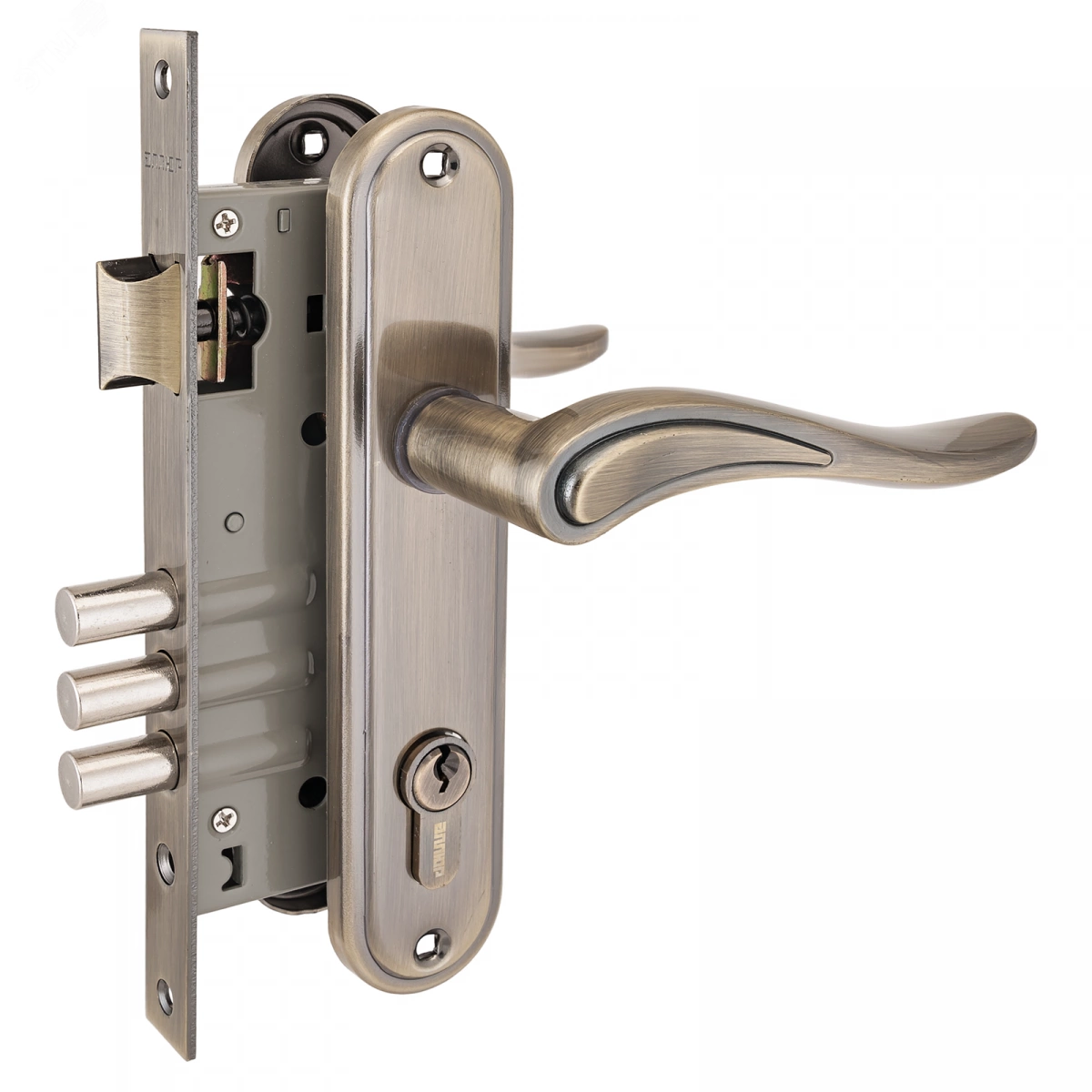 Замок врезной цилиндровый с ручками для деревянных дверей АЛЛЮР 102/3 AB старая бронза