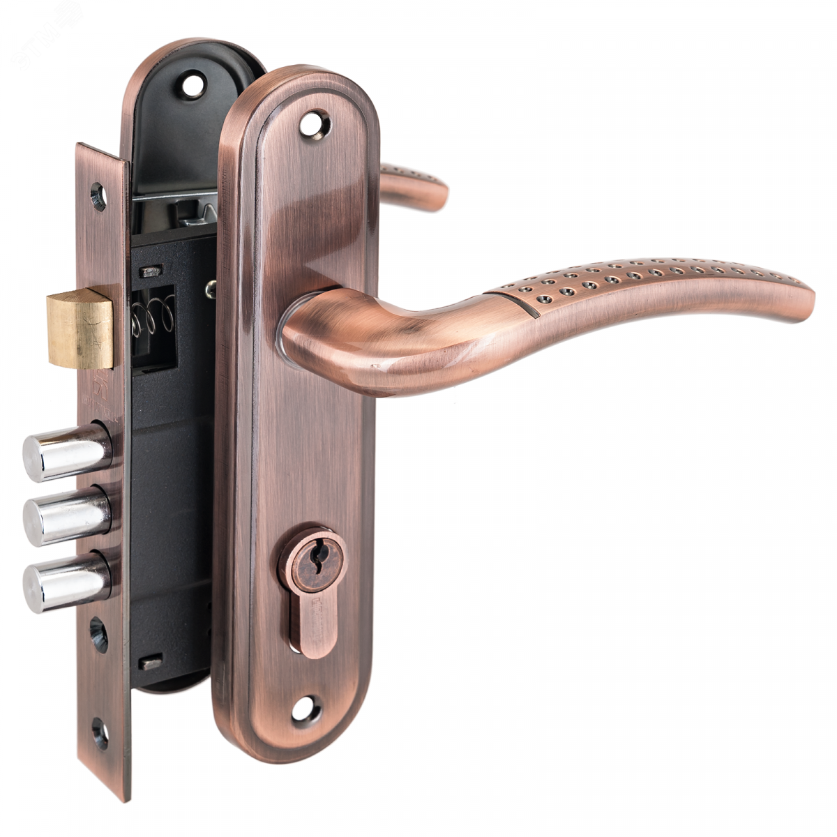 Замок врезной цилиндровый с ручками для деревянных дверей, АЛЛЮР 132/3-61А(1232) AC старая медь