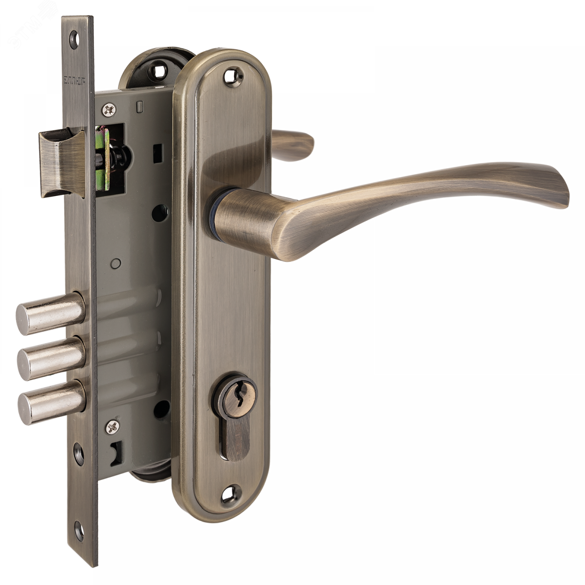 Замок врезной цилиндровый с ручками для деревянных дверей АЛЛЮР 103/3 AB старая бронза