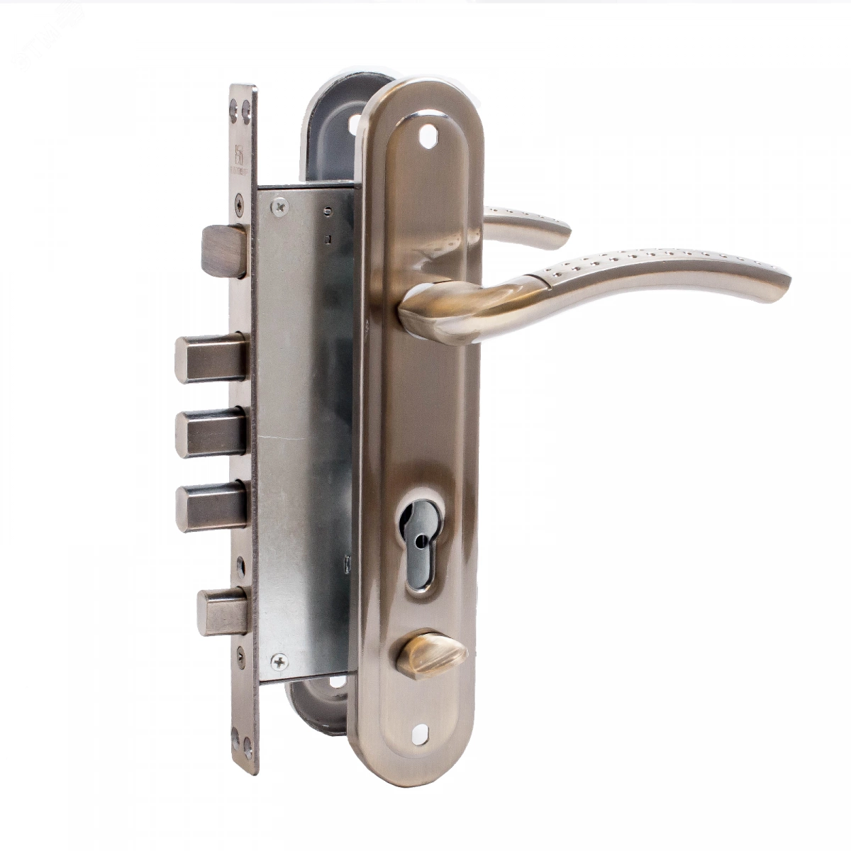 Замок для металлических дверей с усиленной защелкой и ночной задвижкой. Цилиндровый механизм в комплект не входит - приобретается отдельно, в зависимости от толщины двери. Корпус замка - материал сталь, ручки - сталь, алюминиевый сплав. Функция ночной задвижки позволяет закрыть замок таким образом, что его не возможно открыть снаружи с помощью ключа. Бэксет - 60мм, межосевое расстояние - 80мм.
