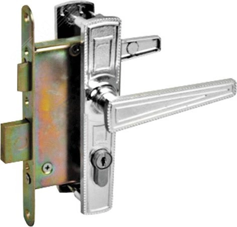 Цилиндровый, межцентровое расстояние 85 мм. Левые и правые двери 40-50 мм. Фалевые ручки с полимерным покрытием. 3-х стержневой засов.