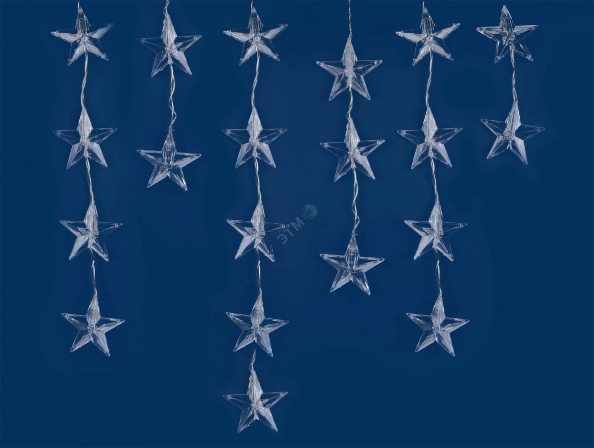 Занавес светодиодный фигурный Звездочки. Размер 5,5х0,5 метра. С бело-голубым свечением, для декоративной подсветки и украшения внутренних интерьеров жилых и административных помещений. Входное напряжение для подключения светодиодной гирлянды 180-2х1,5 метра. Цвет провода - прозрачный. Поставляется в картонной упаковке. Срок службы составляет 50000 часов. Гарантия производителя 12 месяцев.