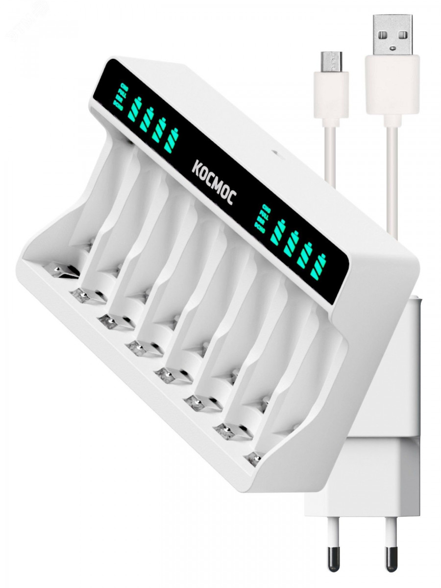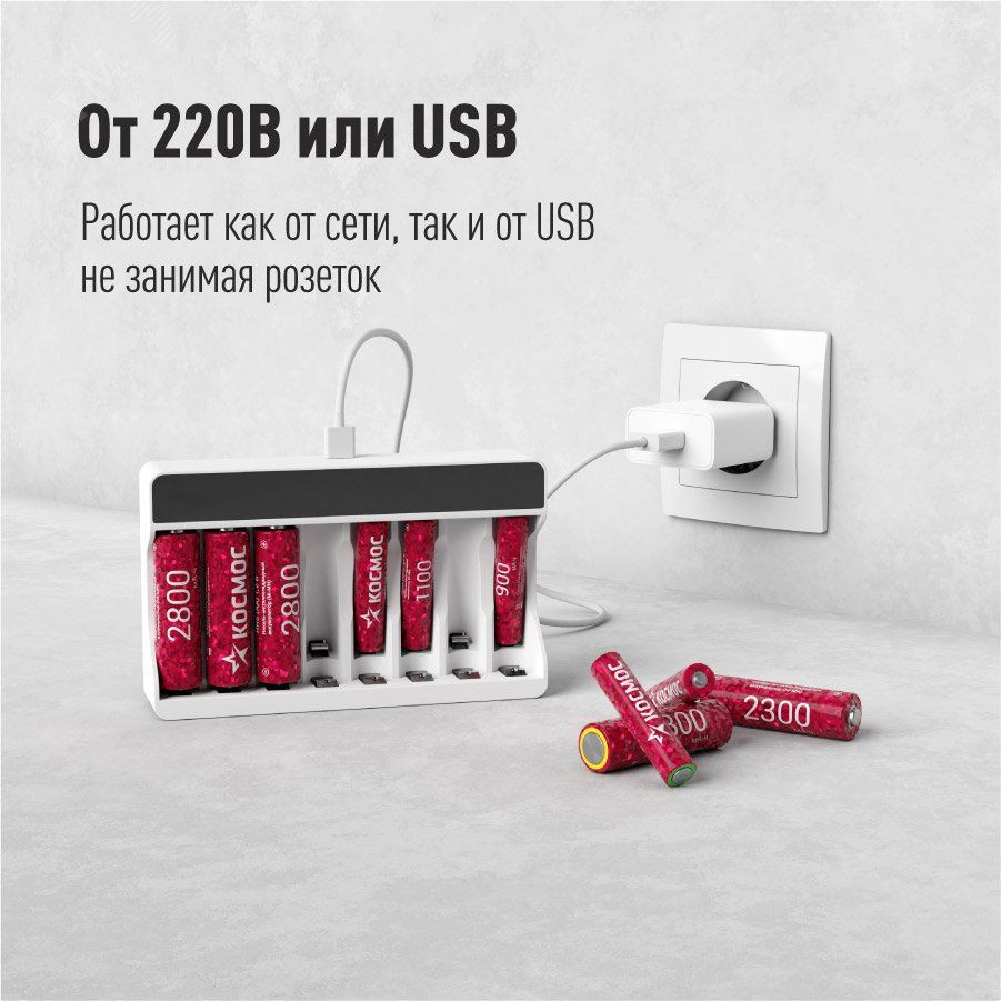 Зарядное устройство для аккумуляторных батареек КОСМОС это надежное и удобное решение для зарядки аккумуляторов. Вы сможете заряжать до 8 аккумуляторов одновременно, что позволит вам всегда иметь запас энергии для вашей электроники. Автоматический режим зарядки позволит вам заряжать NI-MH аккумуляторы AA, AAA. Индикация на корпусе устройства поможет вам контролировать процесс зарядки. Автоматическое зарядное устройство с индикацией заряда каждого канала. Восемь независимых слотов для АА ААА аккумуляторов с индивидуальной индикацией. Дополнительно комплектуется кабелем USB Type-C и блоком питания 2.1А. Блок питания и кабель можно дополнительно использовать как зарядное устройство для смартфона.