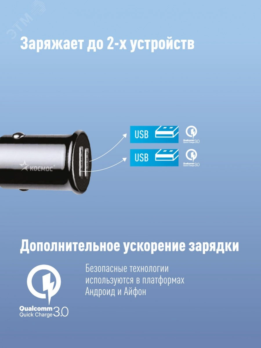 Автомобильное зарядное устройство с двумя разъемами USB . Максимальная мощность 18Вт. Разъем USB:QC3.0: 3.6-6.5V/3.1A 6.5V-9V/2A 12V/1.5AРазъем USB: USB2:5V 3A Его можно подключать к прикуривателям машины с входным напряжением как 12v, так и 24v. Мощная светящаяся супер зарядка подходит для планшета, наушников, смартфона, кнопочного телефона, фотоаппарата, браслета, часов, фонарика, видеорегистратора, видеокамеры, навигатора и очень много других разных электрических приспособлений, требующих высокого уровня питания энергии.