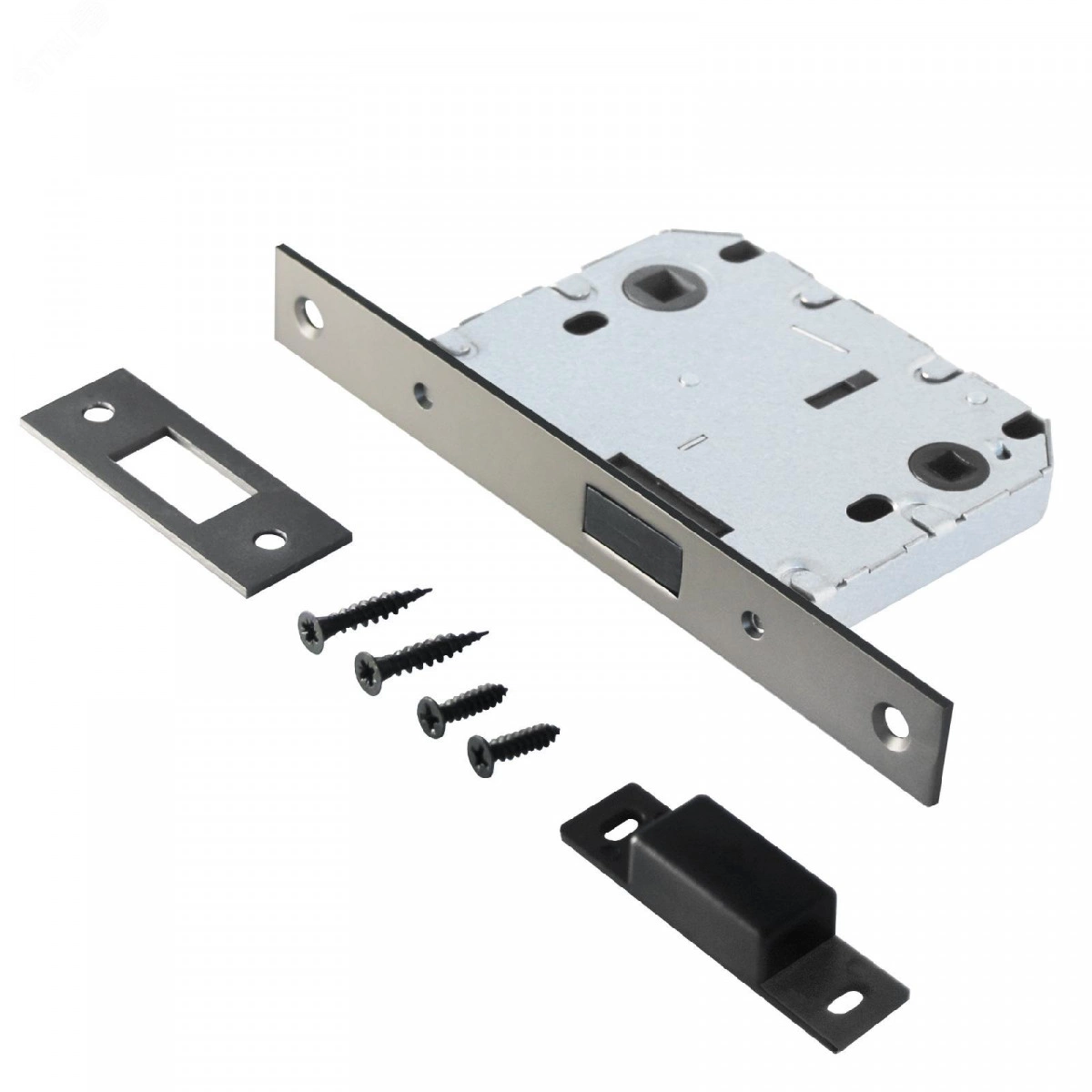 Универсальная магнитная защелка врезная для установки на деревянные межкомнатные двери. Материал - сталь, магнит, гальваническое покрытие.Под ручку с квадратом 8мм и сантехническую завертку с квадратом 6мм. Удаление ключевого отверстия - 50мм. Межосевое расстояние - 70мм. Прямоугольная торцевая планка. Ширина планки - 20мм. Габариты корпуса - 97х75х12мм. В комплекте - защелка, саморезы, ответная планка.