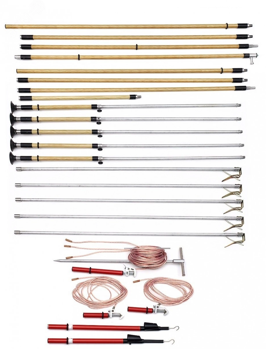Заземление переносное КШЗУ-0,4-10Э (Универсальный комплект штанг для наложения заземления с ПЗ) предназначен для заземления проводов отключенных ВЛ напряжением 0,4-10 кВ непосредственно с поверхности земли, с указателями напряжения для проверки наличия или отсутствия напряжения на воздушных линиях.